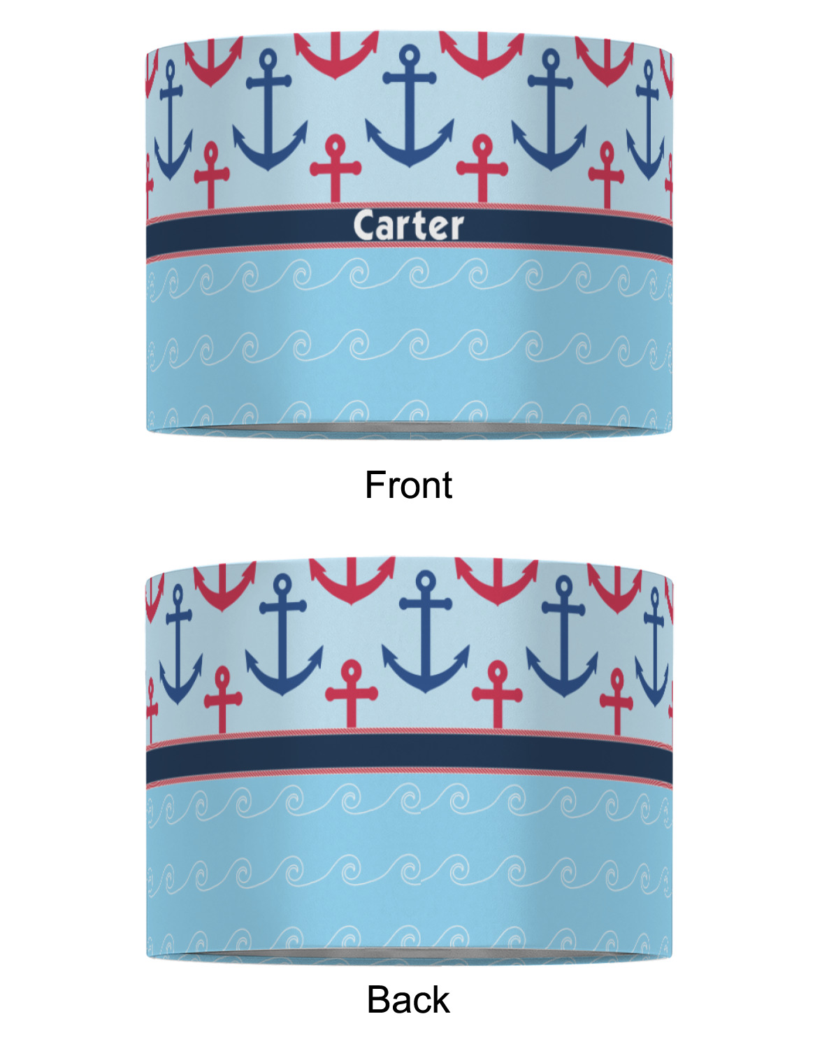 This fun nautical design features a versatile light blue background with red and blue anchors pattern on the top with coordinating light blue ocean waves on the bottom. A red stripe with a nautical darker blue rope top and bottom brings both patterns together to create a beautiful nautical design.