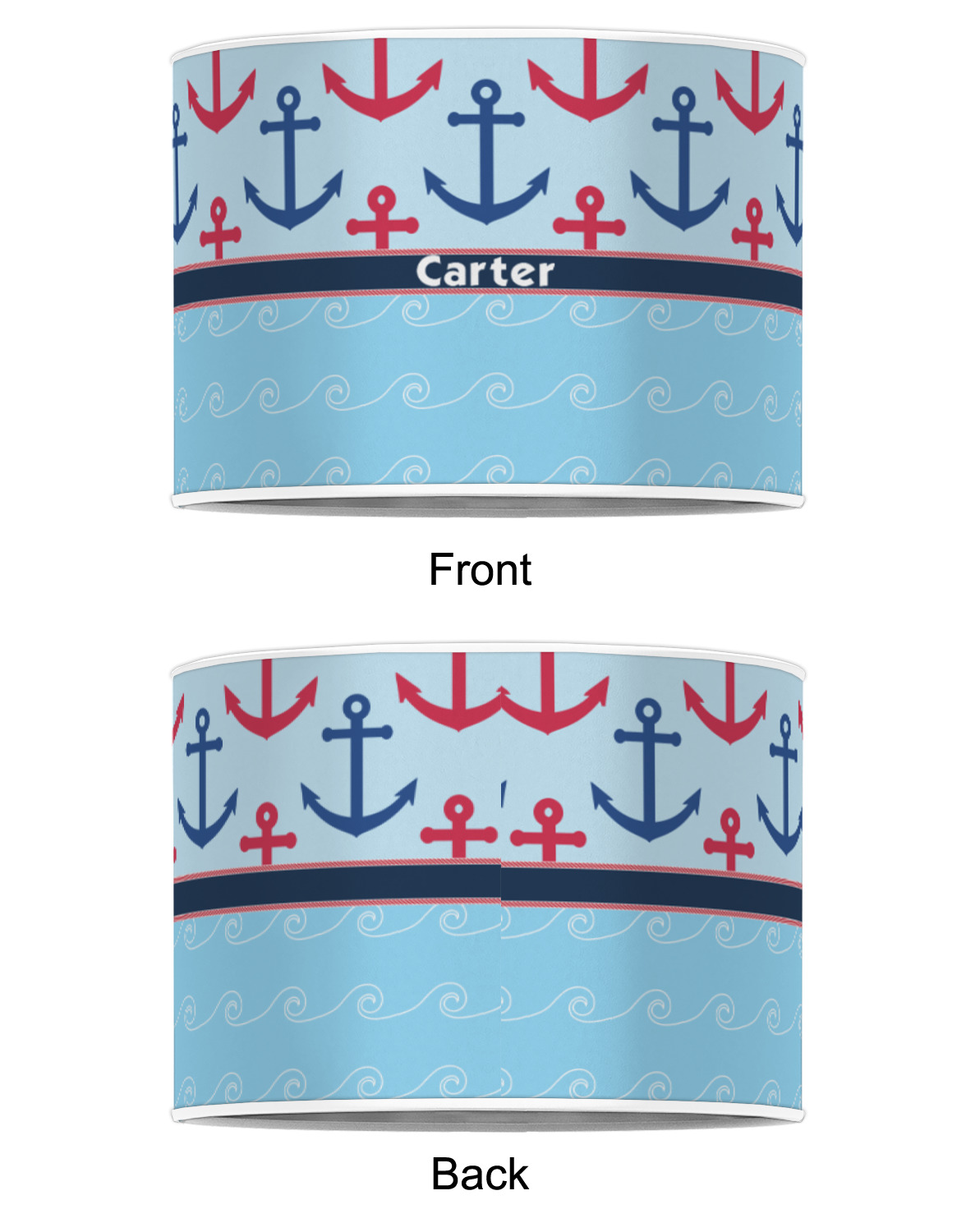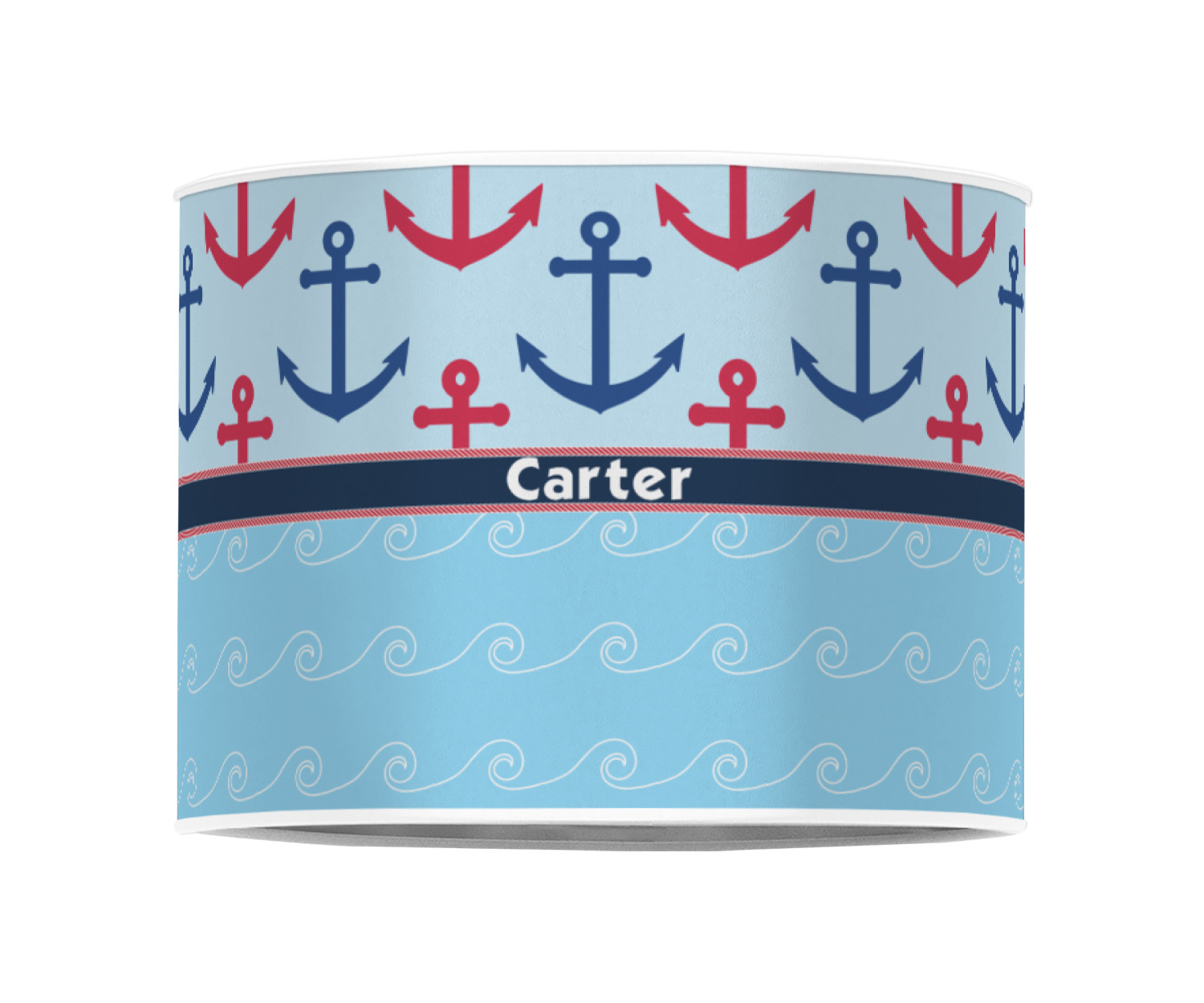 This fun nautical design features a versatile light blue background with red and blue anchors pattern on the top with coordinating light blue ocean waves on the bottom. A red stripe with a nautical darker blue rope top and bottom brings both patterns together to create a beautiful nautical design.