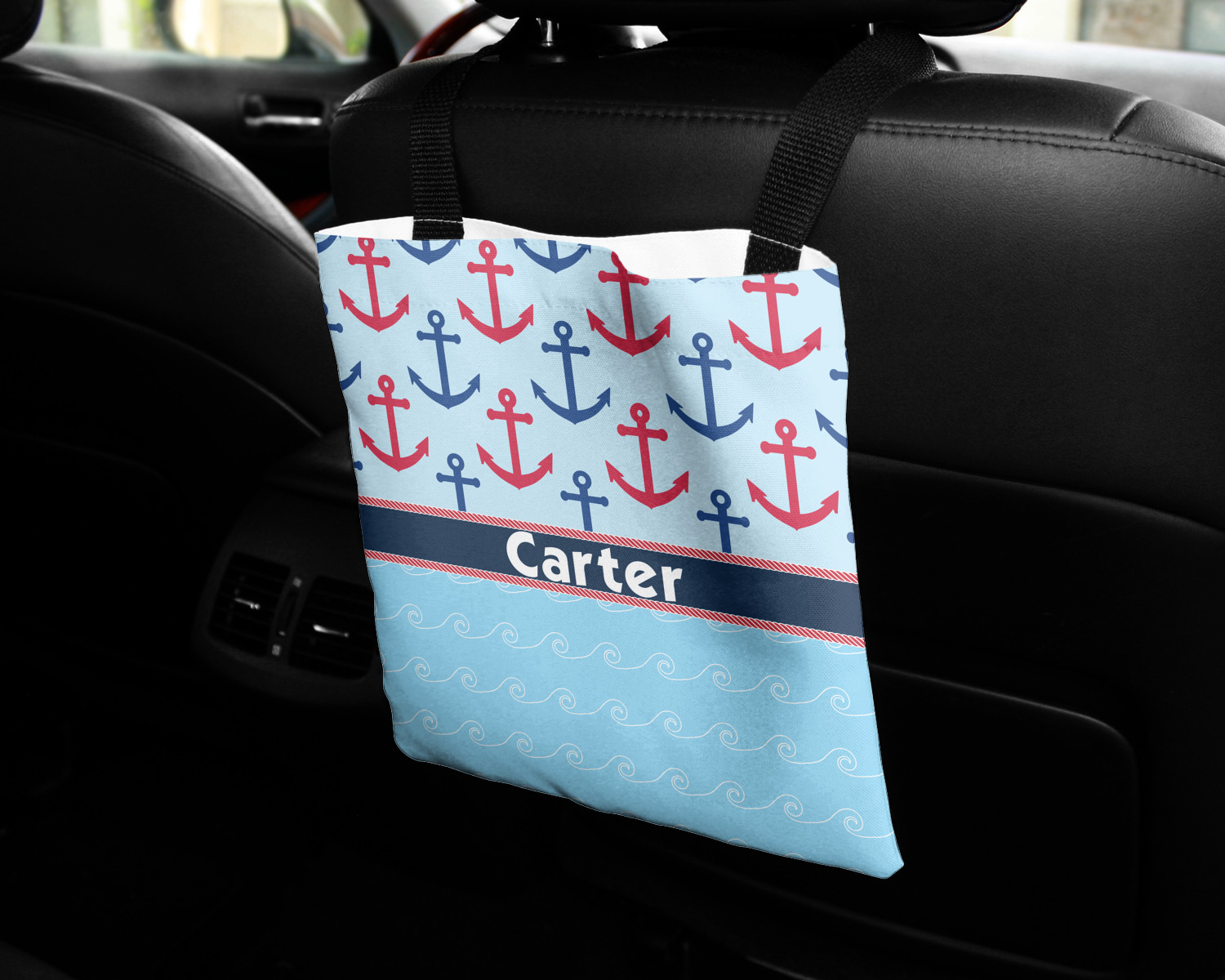 These car back seat organizers are sturdy tote-like bags, fabricated from a robust polyester, and features a single handle on the back side. The strap features an attachable velcro for easy attachment to headrests, grocery carts, car seats, and more. Simply undo the velcro, loop the strap around the headrest, reattach the velcro, and let the organizer hang from the front seat. These car organizers are the perfect means of increasing your backseat's legroom, while storing multiple items in one place for better accessibility. Each car back seat organizer measures at 10 by 10 inches, and features your personalized design printed across its front and back.