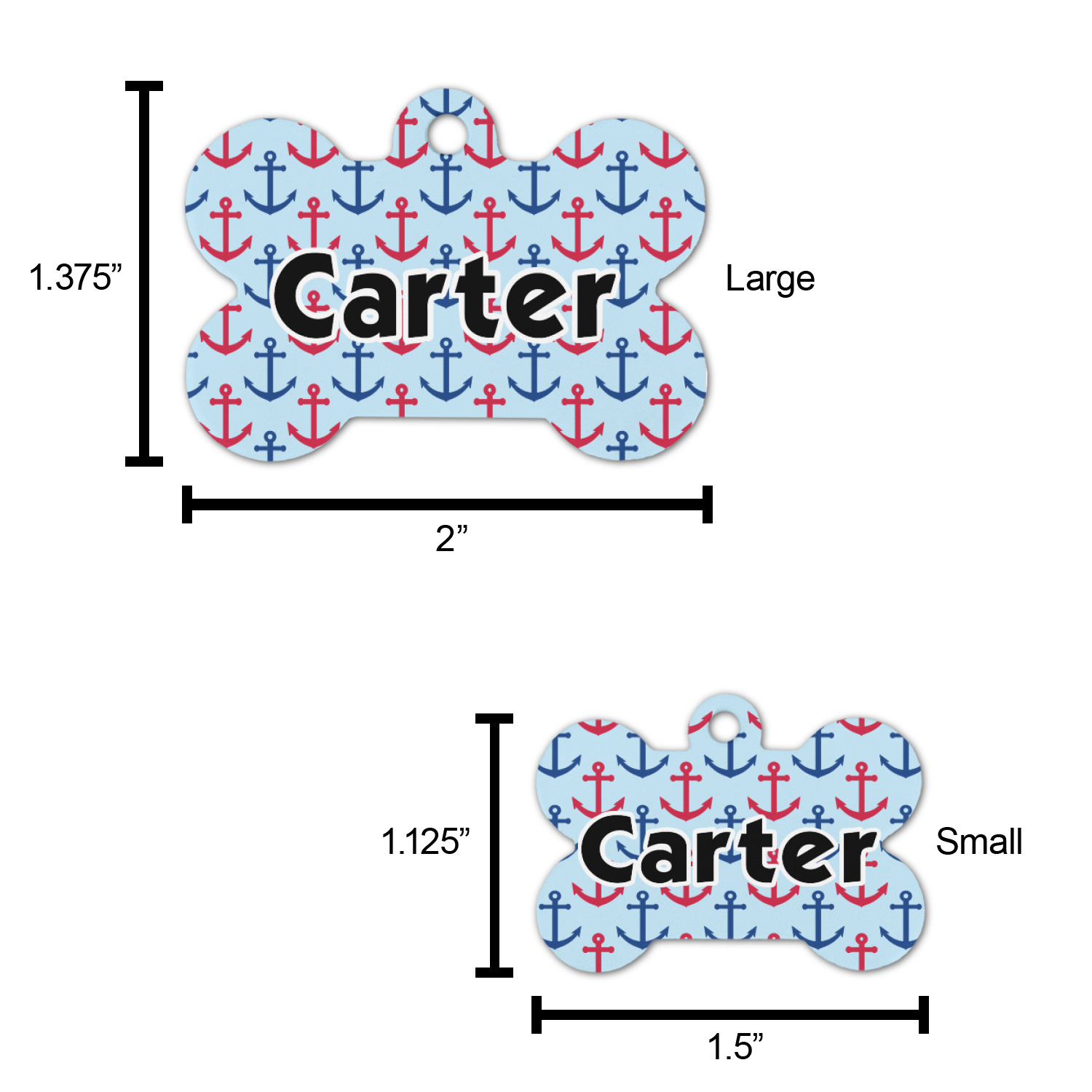 The small bone dog tag size is perfect to pair with our small dog collars, the large size pairs well with our large dog collars.