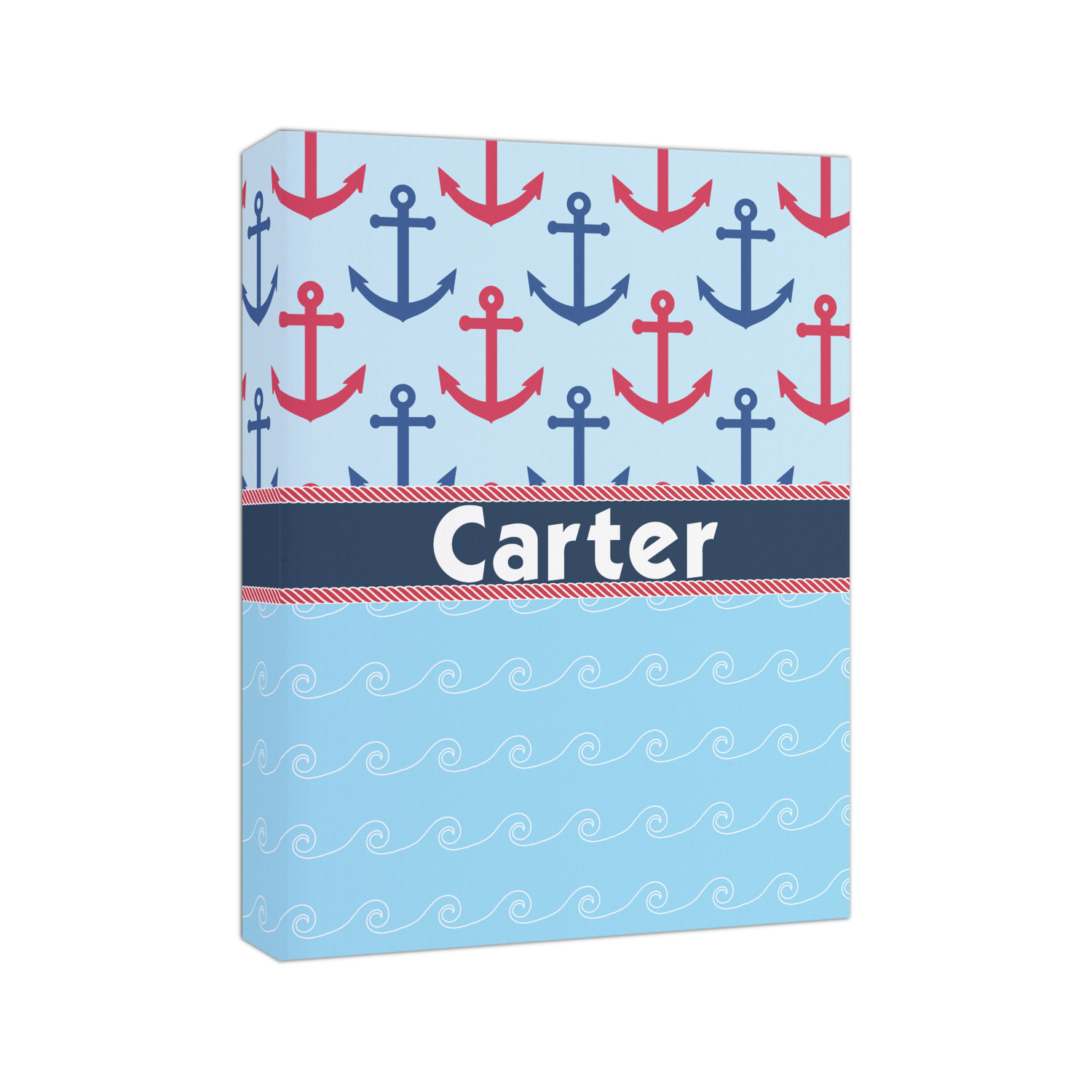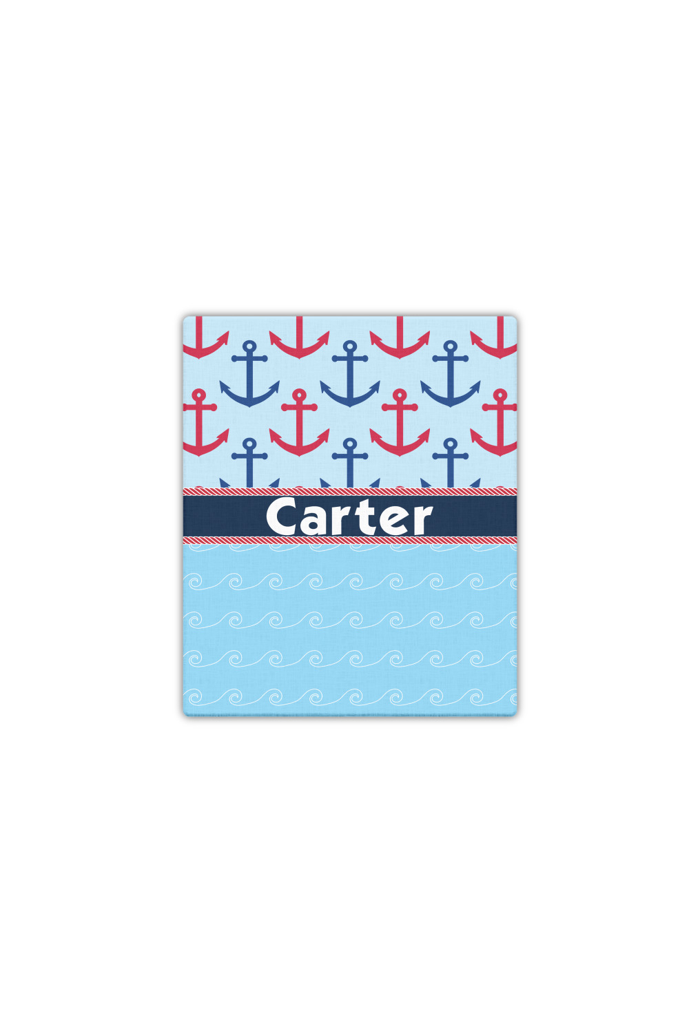 This fun nautical design features a versatile light blue background with red and blue anchors pattern on the top with coordinating light blue ocean waves on the bottom. A red stripe with a nautical darker blue rope top and bottom brings both patterns together to create a beautiful nautical design.