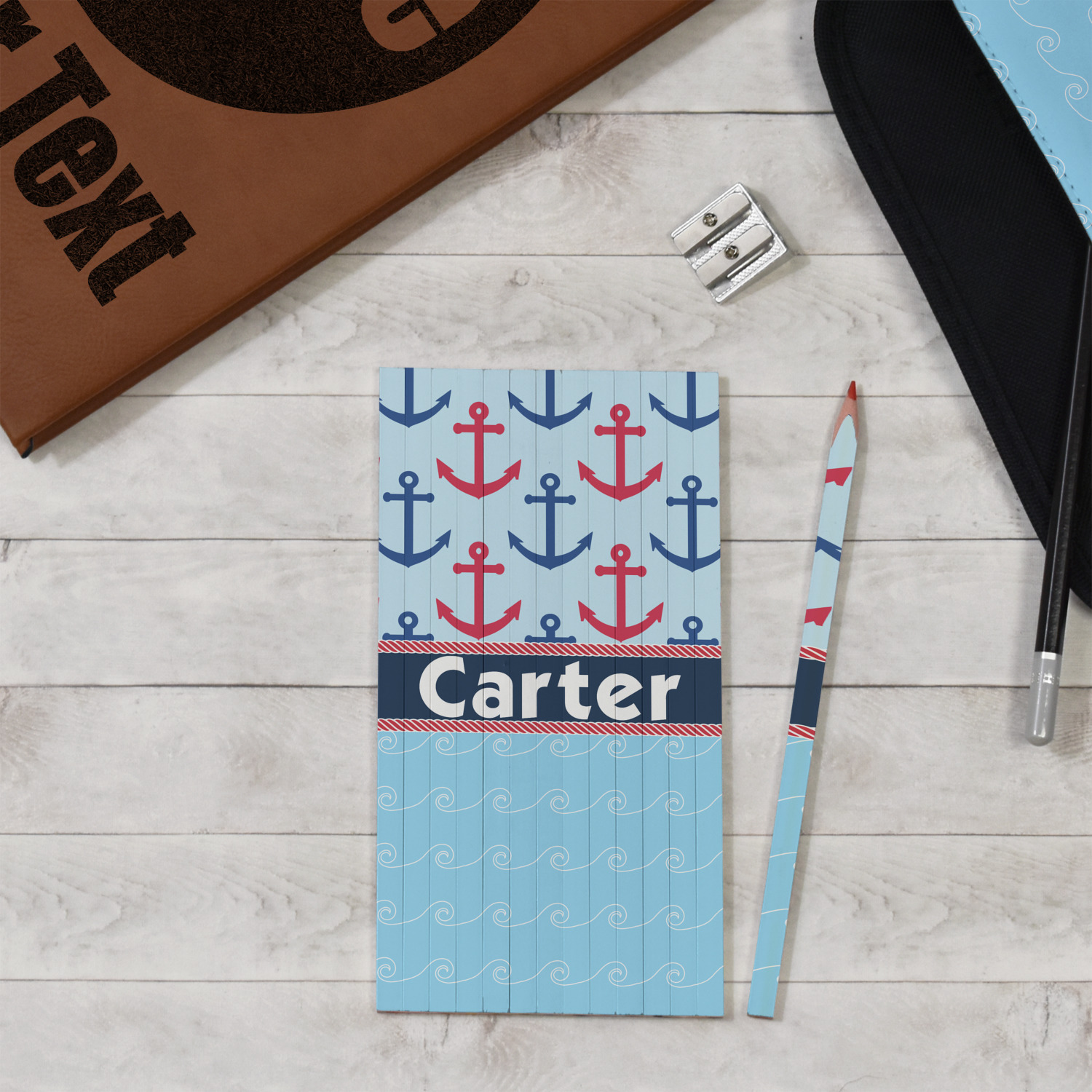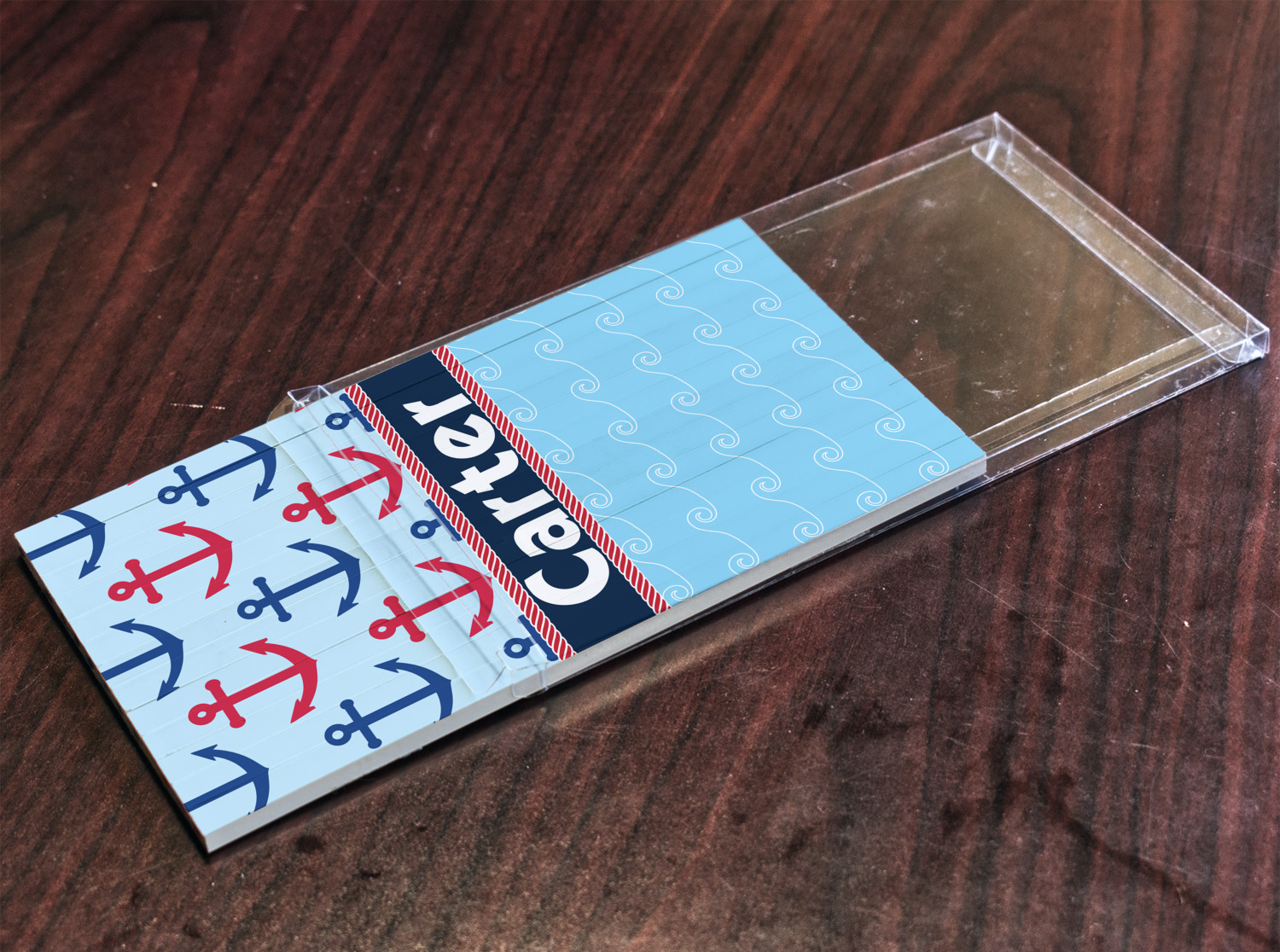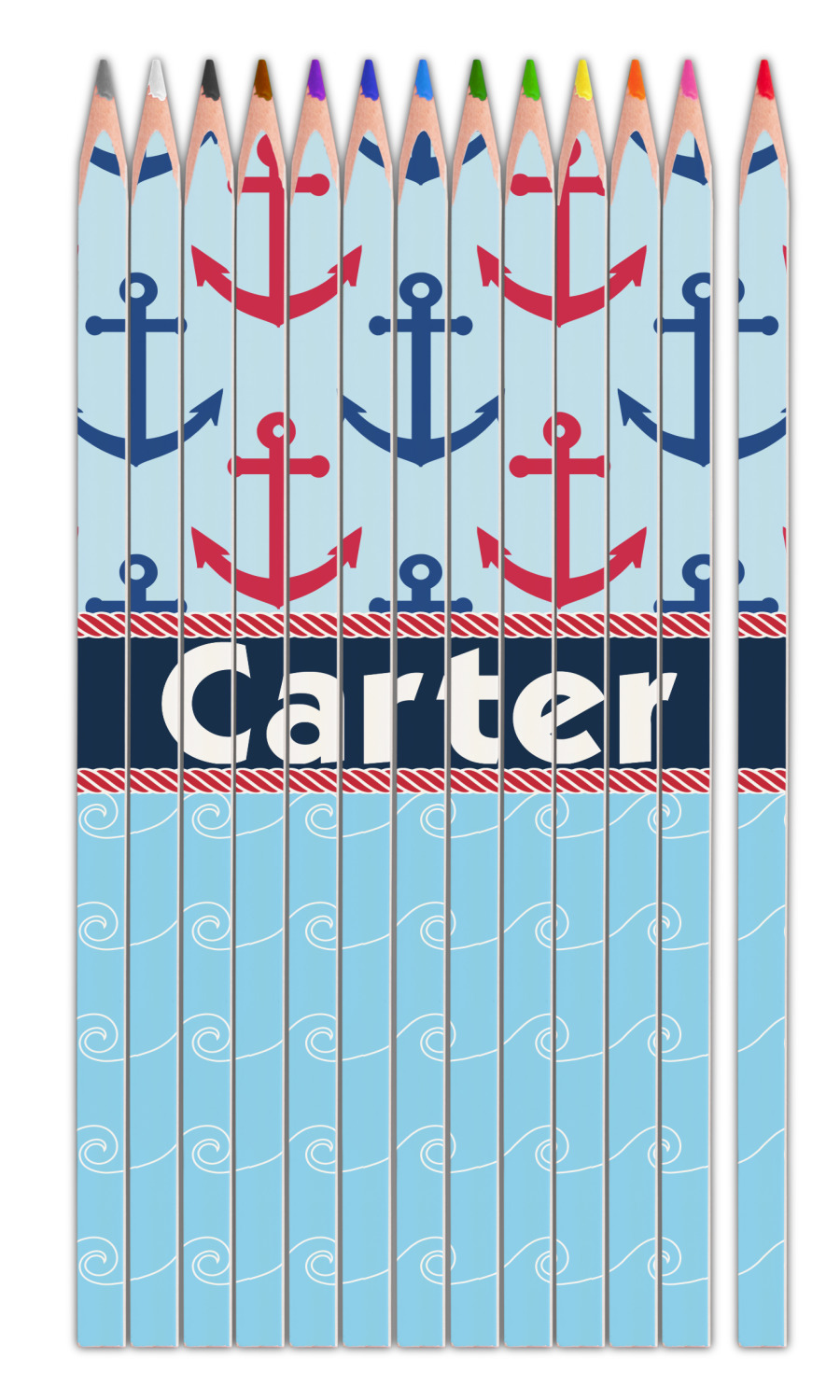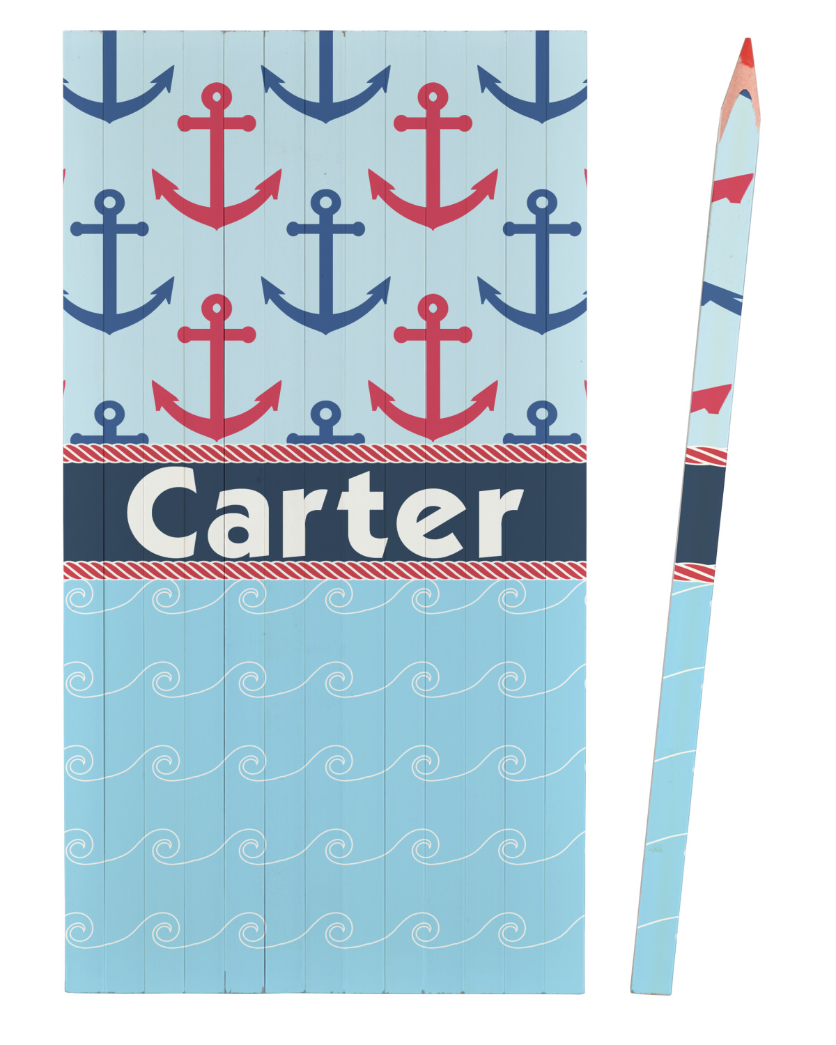 This fun nautical design features a versatile light blue background with red and blue anchors pattern on the top with coordinating light blue ocean waves on the bottom. A red stripe with a nautical darker blue rope top and bottom brings both patterns together to create a beautiful nautical design.