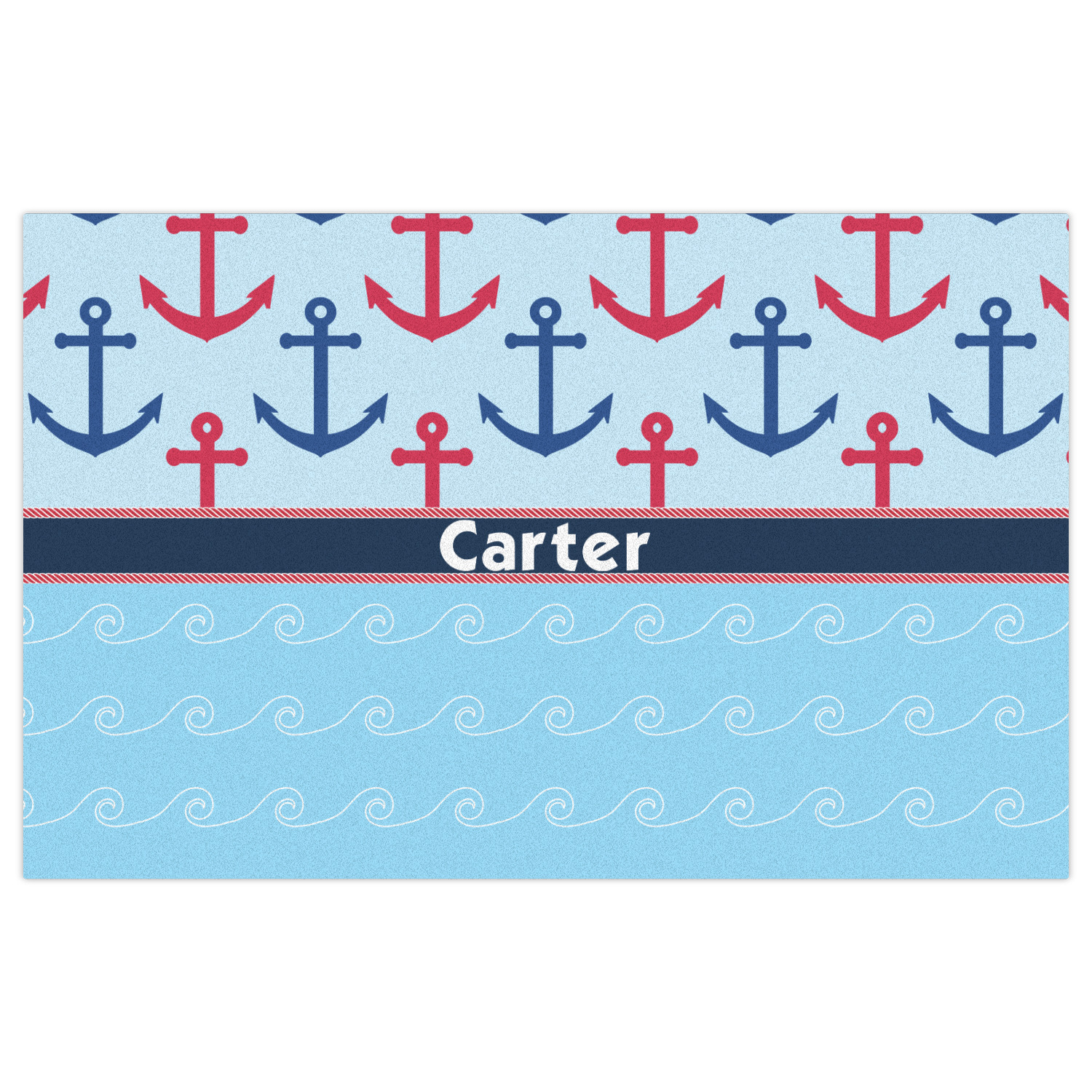This fun nautical design features a versatile light blue background with red and blue anchors pattern on the top with coordinating light blue ocean waves on the bottom. A red stripe with a nautical darker blue rope top and bottom brings both patterns together to create a beautiful nautical design.