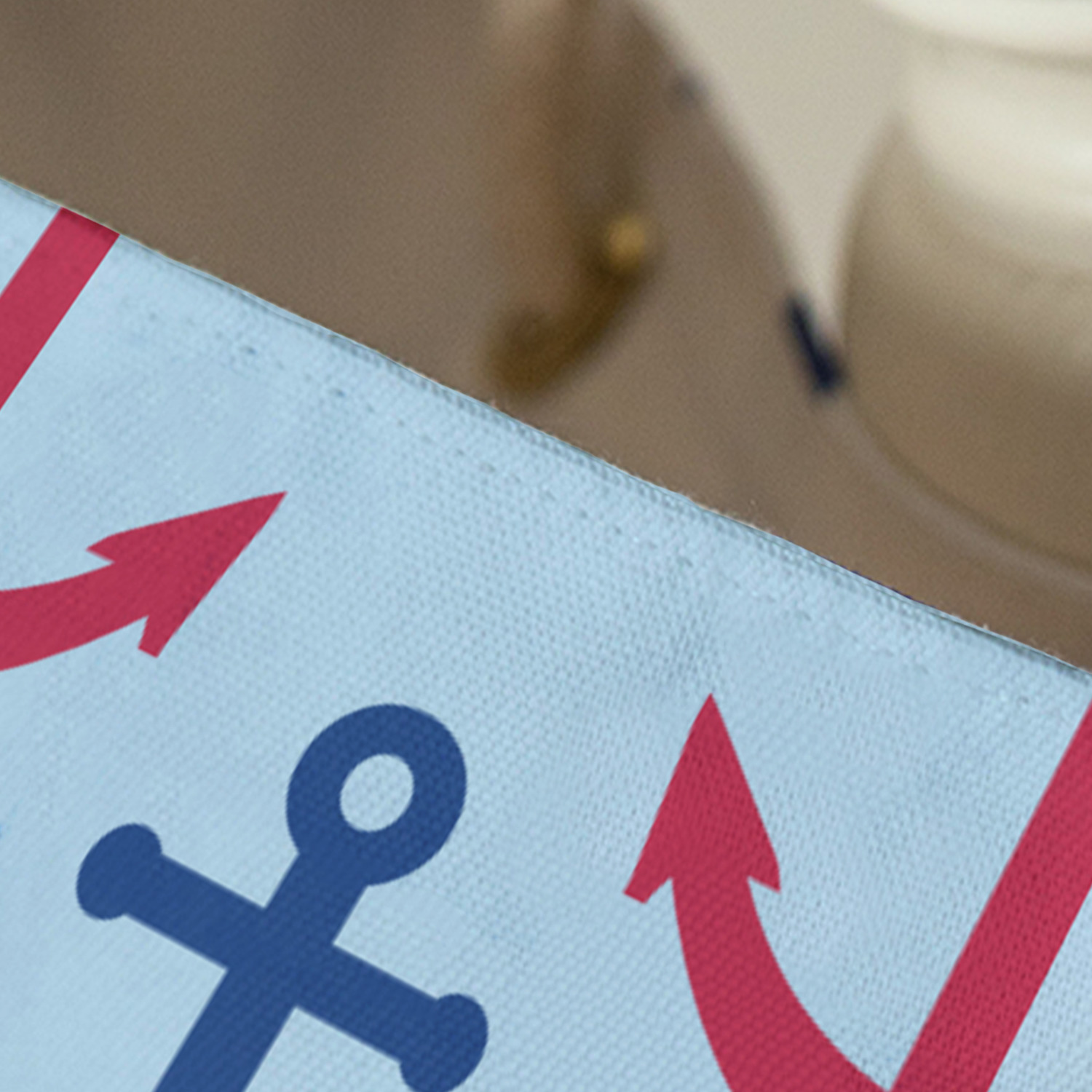 This fun nautical design features a versatile light blue background with red and blue anchors pattern on the top with coordinating light blue ocean waves on the bottom. A red stripe with a nautical darker blue rope top and bottom brings both patterns together to create a beautiful nautical design.
