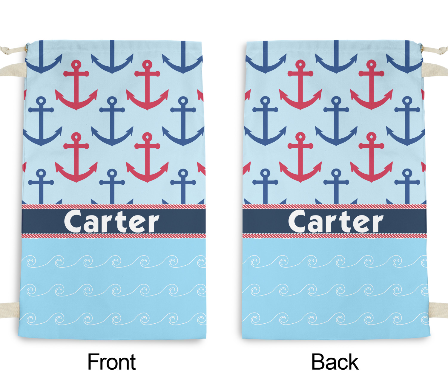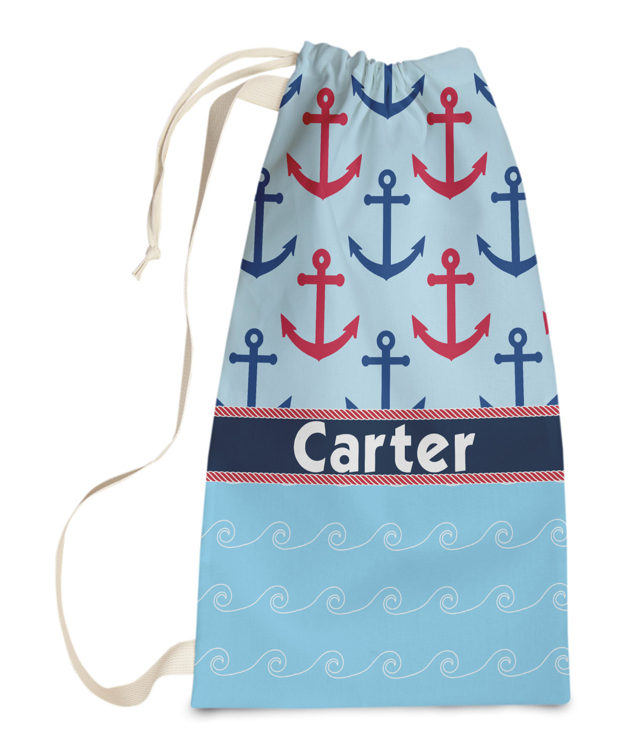 Carry your laundry in style with these customized laundry bags. Available in two sizes, featuring a natural colored woven strap and a cinch cord, these bags hold a lot of clothes or anything else you want to fit in them.