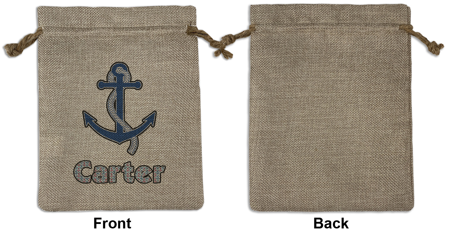 We sell our Burlap Gift Bags in 3 variant sized bags. Made with burlap polyester, each personalized bag can be secured with a twine drawstring pull. Your custom design is available to print on one side or both sides - completely up to you! The sizes of the bags measure approximately 4.5" x 6.5" for the smallest size, 6.5" x 8.0" for the medium size, and 6.5" x 13.5" for the large-sized bag.