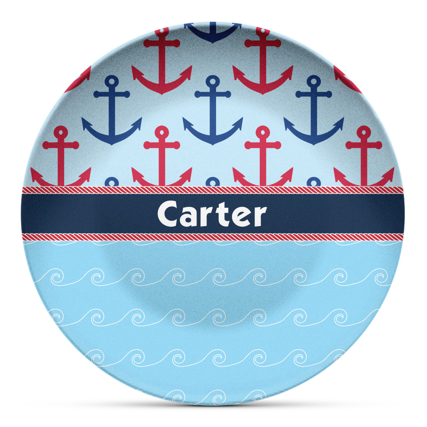 This fun nautical design features a versatile light blue background with red and blue anchors pattern on the top with coordinating light blue ocean waves on the bottom. A red stripe with a nautical darker blue rope top and bottom brings both patterns together to create a beautiful nautical design.
