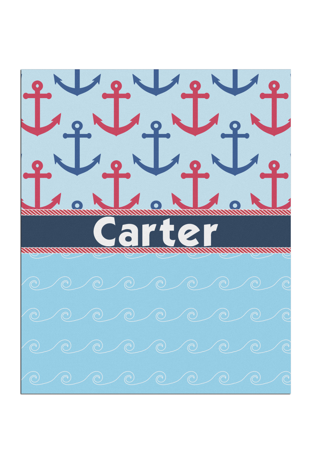 This fun nautical design features a versatile light blue background with red and blue anchors pattern on the top with coordinating light blue ocean waves on the bottom. A red stripe with a nautical darker blue rope top and bottom brings both patterns together to create a beautiful nautical design.