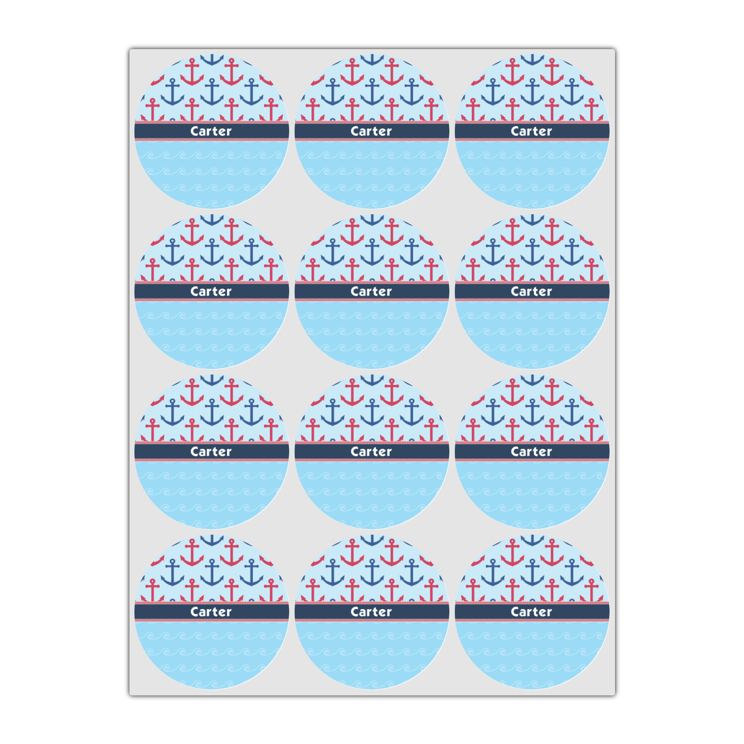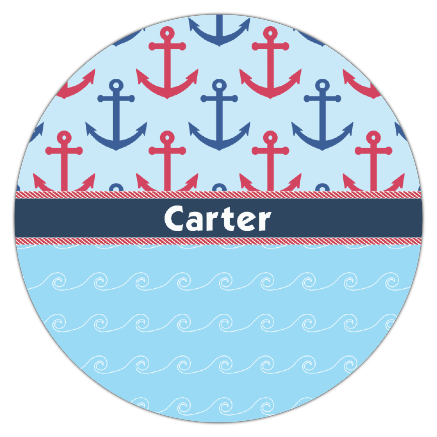 This fun nautical design features a versatile light blue background with red and blue anchors pattern on the top with coordinating light blue ocean waves on the bottom. A red stripe with a nautical darker blue rope top and bottom brings both patterns together to create a beautiful nautical design.