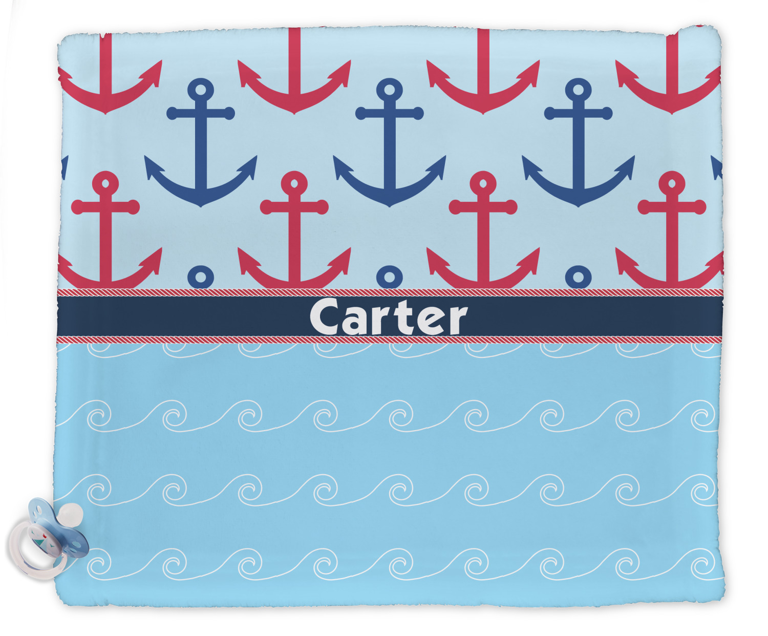 This fun nautical design features a versatile light blue background with red and blue anchors pattern on the top with coordinating light blue ocean waves on the bottom. A red stripe with a nautical darker blue rope top and bottom brings both patterns together to create a beautiful nautical design.