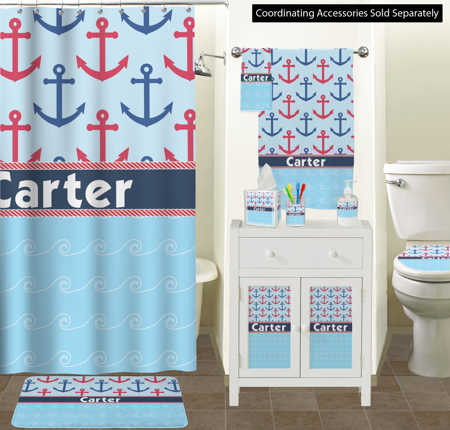 This fun nautical design features a versatile light blue background with red and blue anchors pattern on the top with coordinating light blue ocean waves on the bottom. A red stripe with a nautical darker blue rope top and bottom brings both patterns together to create a beautiful nautical design.