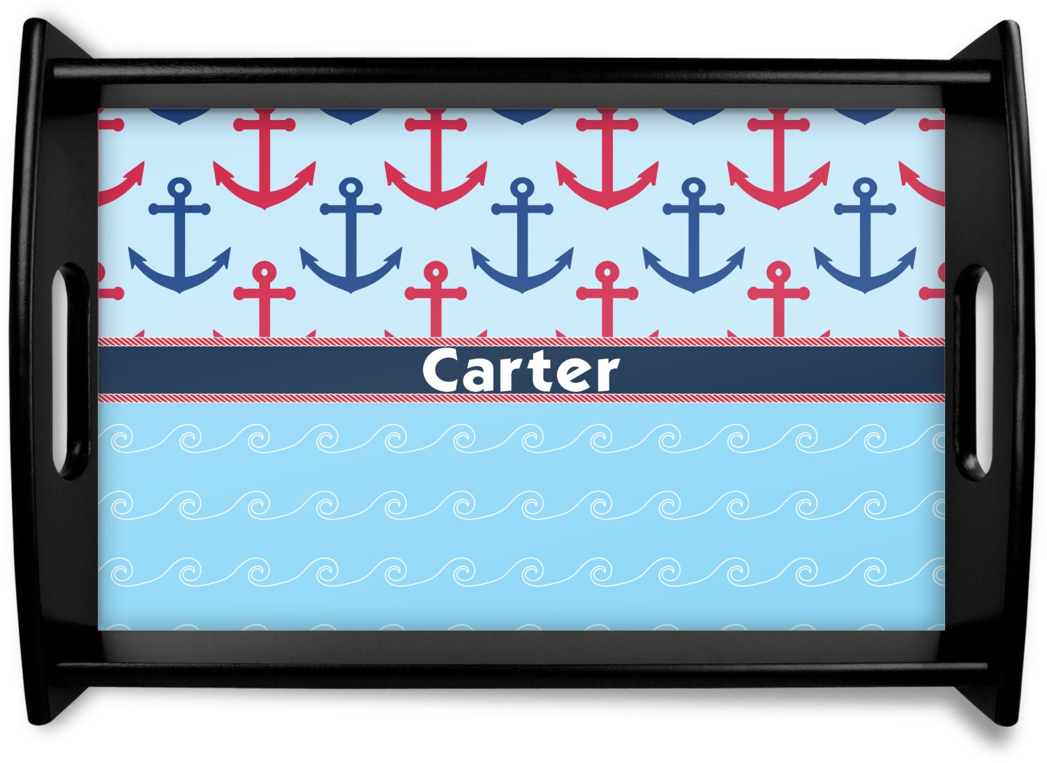 This serving tray with handles features square edges and two rounded sides, creating a very modern look. Each side is fabricated from a beautifully cut, natural wood. The bottom of the interior of the tray displays your customized design in bright, vibrant color. The tray is sold in both a black color and a natural wood look. Each variation of the wood serving tray has two sizes: Small, which is 14" x 10" x 2.25", and Large, which is 19.5" x 13.5" x 2.75".