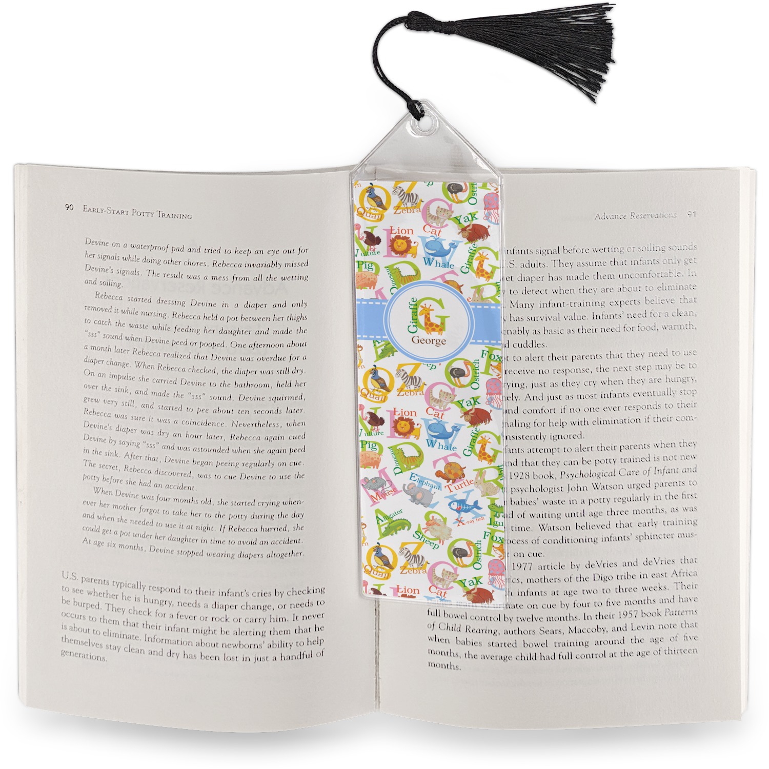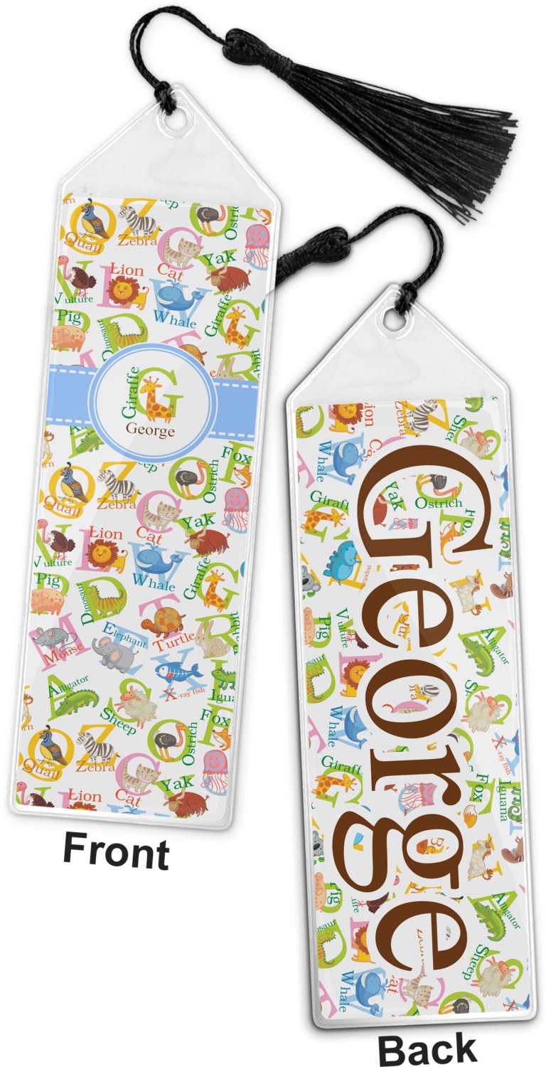 Your personalized bookmark is made of a sturdy, clear vinyl, and is approximately 7.5" x 2.25". We display your personalization on vinyl inserts that are placed on both sides. Accompanying each book marker is a black, fringe tassel that attaches to the reinforced, triangular header.