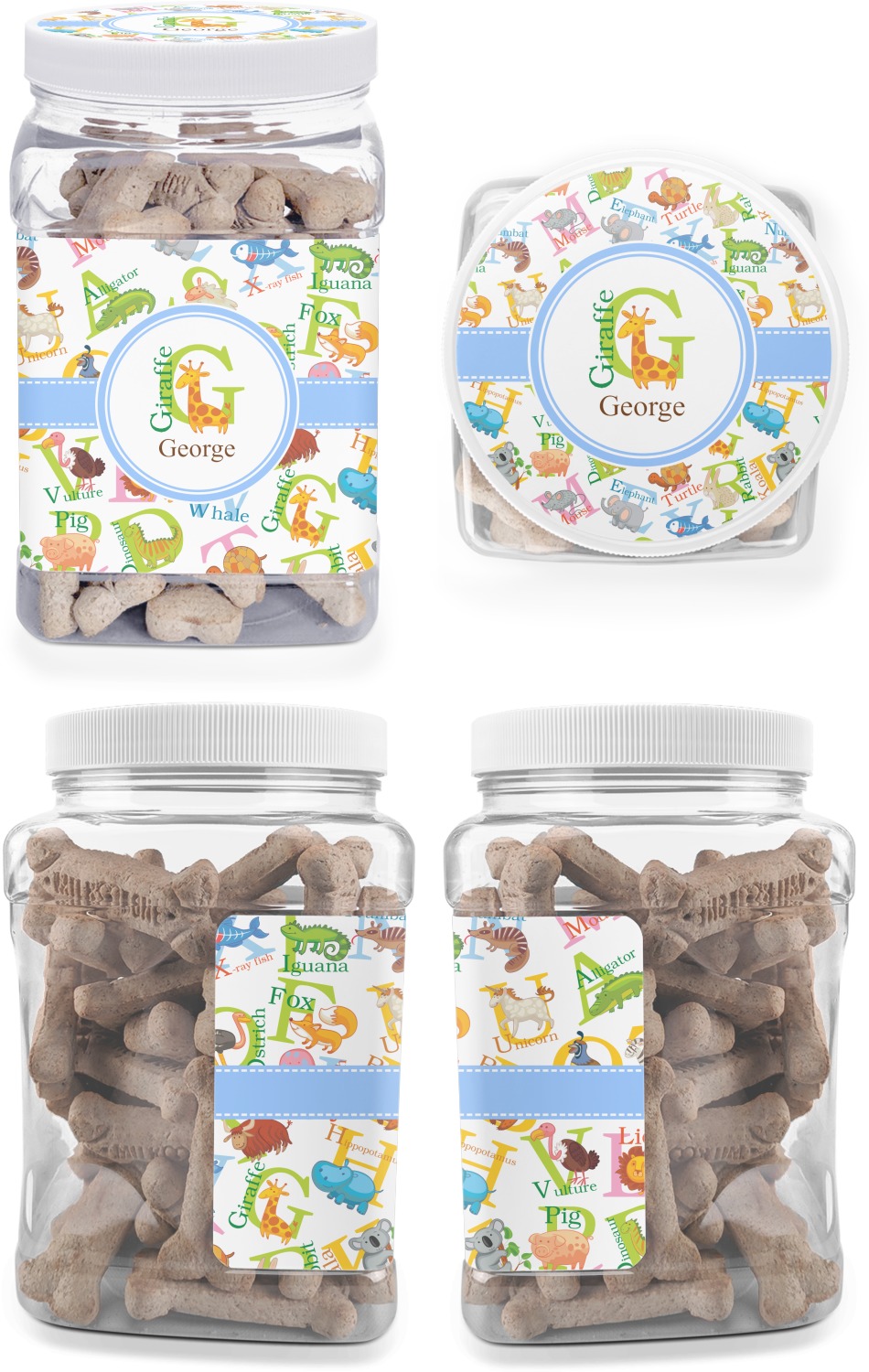 This half gallon jar, made from a sturdy plastic, is the perfect way to keep treats from any naughty pet paws, while still keeping them ready on hand for when your pup performs an impressive trick. This dog cookie jar features a screw-on, white lid that displays your personalized design on a vinyl sticker. We apply another customized sticker that wraps around the front and sides of the jar. Our dog treat jar also has indentations on the rear ends of the sides, which allows for convenient handling, and its square frame allows for easy storage.