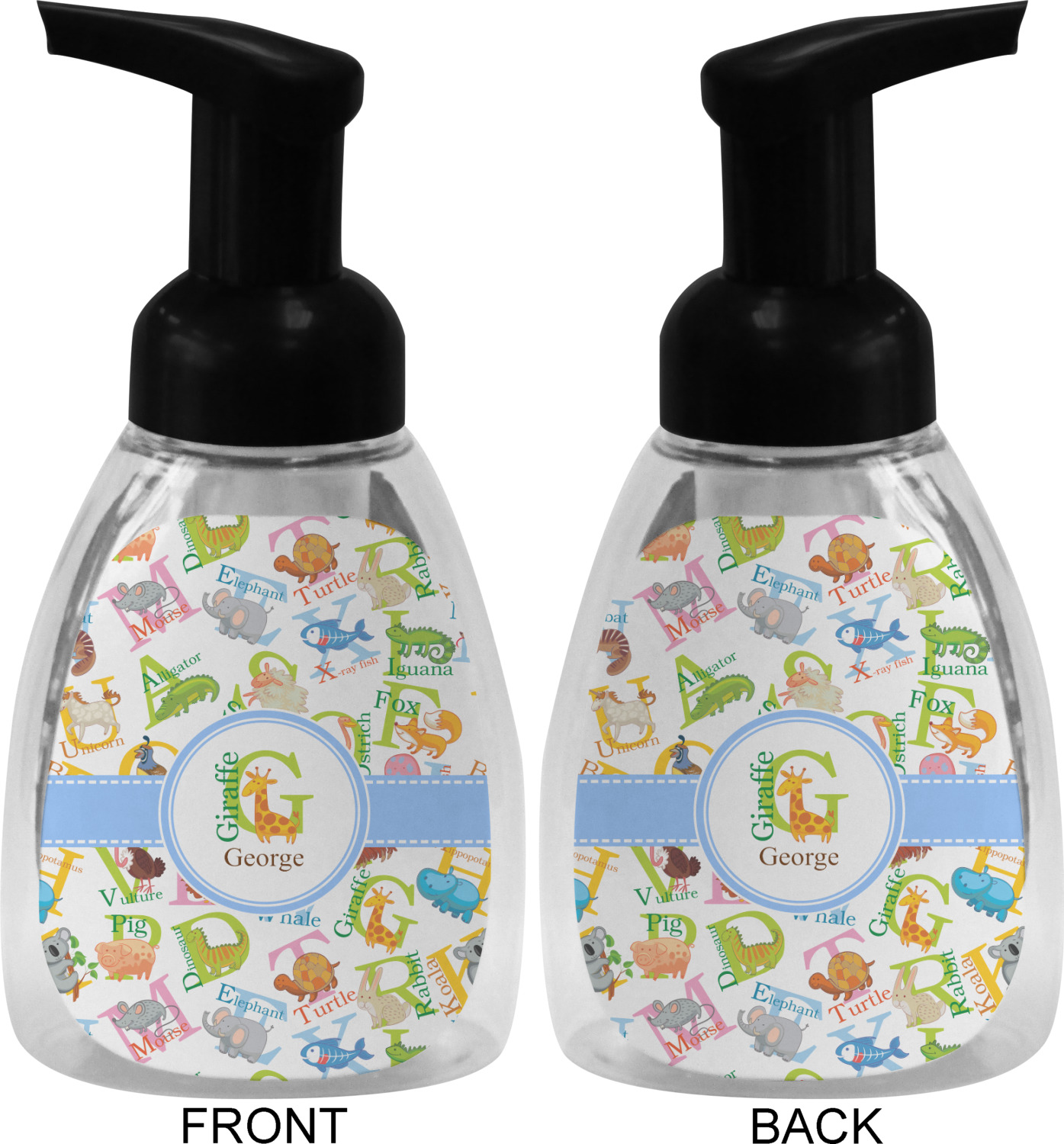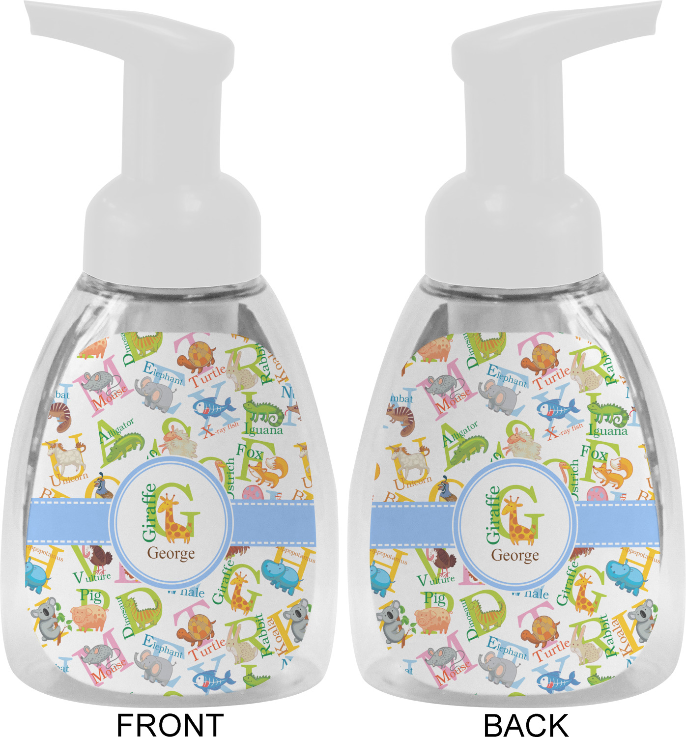 This soap dispenser is made of a robust plastic and has a clear base. The included soap pump is available in black or white color. This dispenser is 6.5 inches tall, 3 inches wide, and 2 inches deep. We display your customized designs on the front and back sides of these foaming hand soap dispensers.