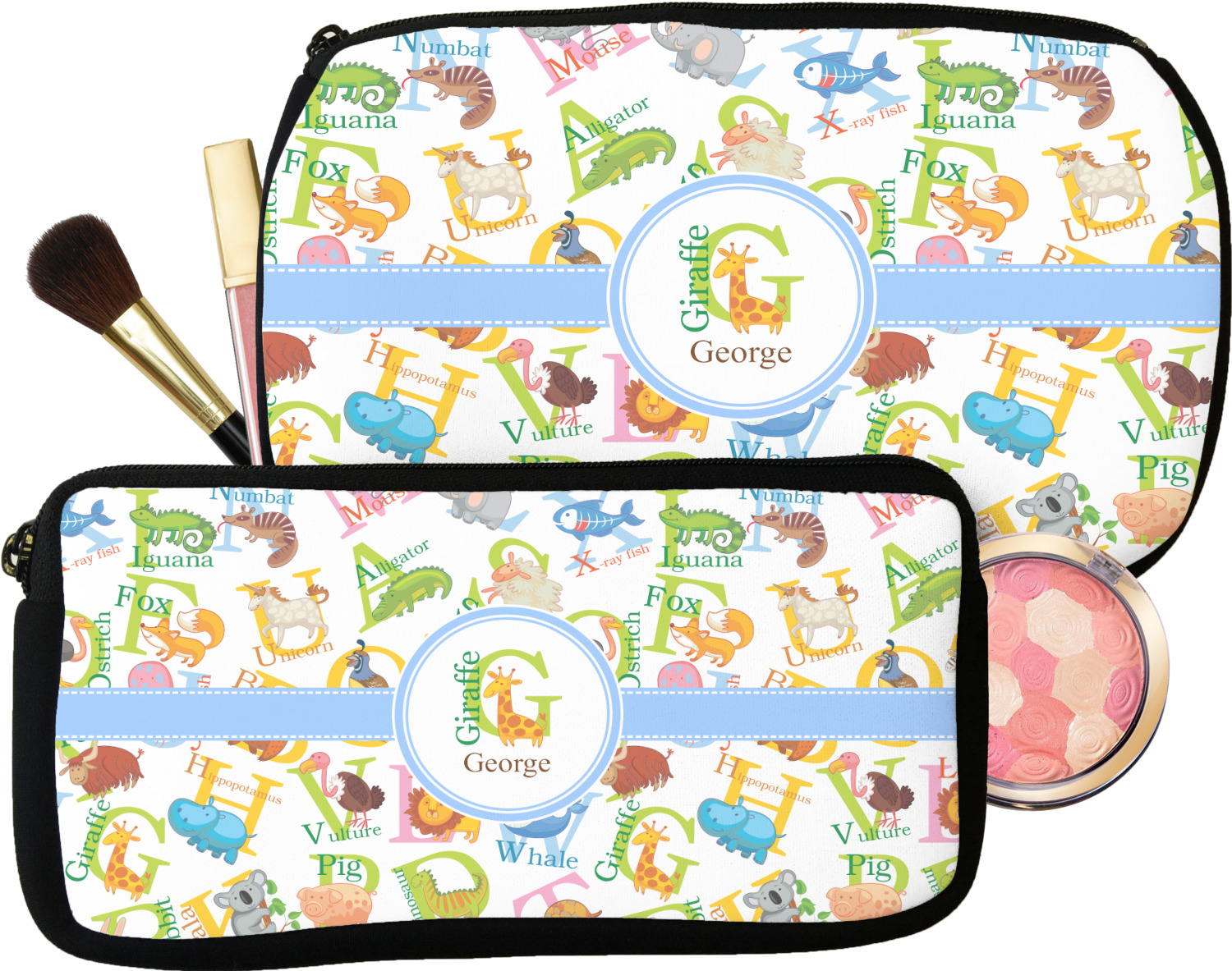 Our personalized makeup bags are available in many different designs, patterns and colors - so you are sure to find one that will love. They are made of neoprene (same material as wet-suits) and thus are water resistant, so spillages in your makeup bag will not end up all over you purse. They are customized on one side and are black on the other side and the zipper is black as well.