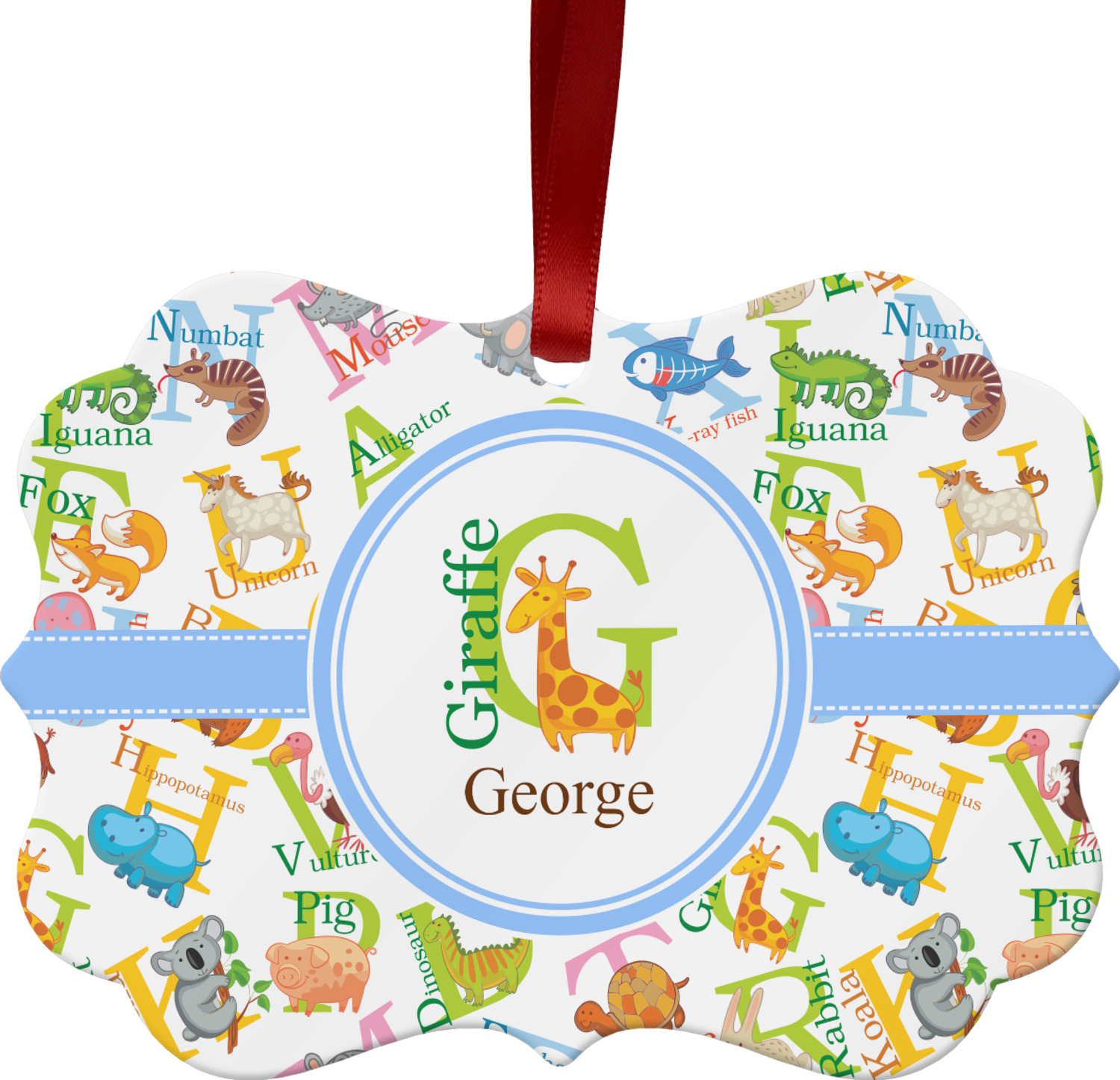 We chose baby blue ribbon with stitching and a round label. For personalization we chose the G for Giraffe and George! With us, you always have a choice of many different colors, label and ribbon styles. For personalization, you can chose the animal alphabet associated with the initial (see image) or you can just choose the animal or you can select a completely different style such as a monogram or a name & initial. You can try our the various combinations in our customization system to see which combination you like the best!