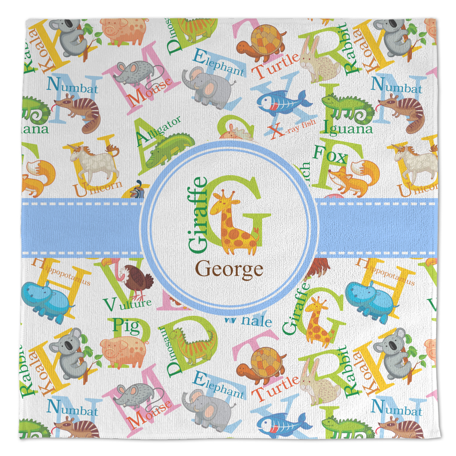 This animal alphabet design is perfect for babies and toddlers. The background consists of animals associated with all 26 letters of the alphabet. A for Alligator, B for Bear, C for Cat - all the way to W for Whale, X for X Ray Fish and Z for Zebra. We chose a white background for our design - however the background is re-colorable and also looks great with any pastel color.