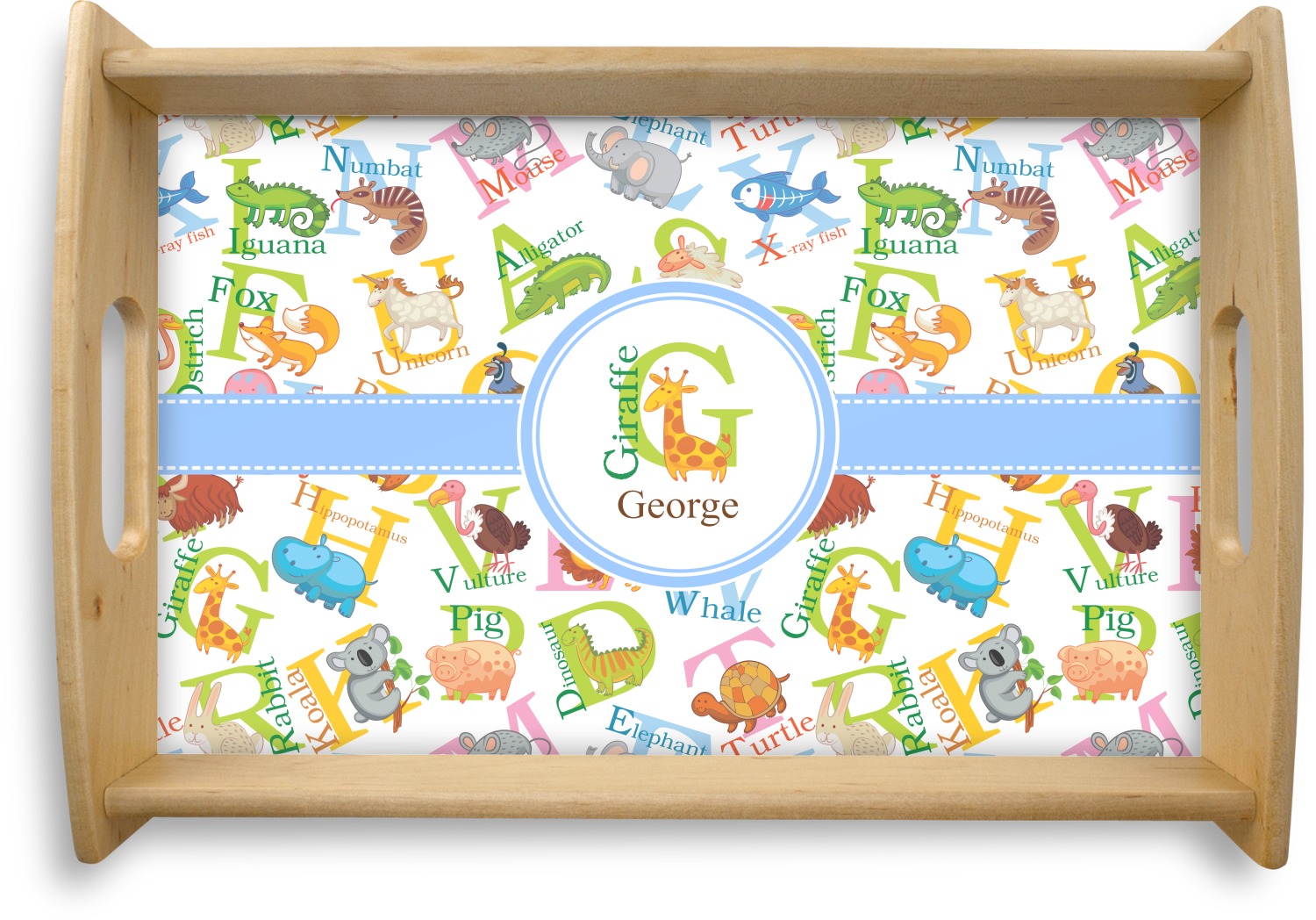 This serving tray with handles features square edges and two rounded sides, creating a very modern look. Each side is fabricated from a beautifully cut, natural wood. The bottom of the interior of the tray displays your customized design in bright, vibrant color. The tray is sold in both a black color and a natural wood look. Each variation of the wood serving tray has two sizes: Small, which is 14" x 10" x 2.25", and Large, which is 19.5" x 13.5" x 2.75".