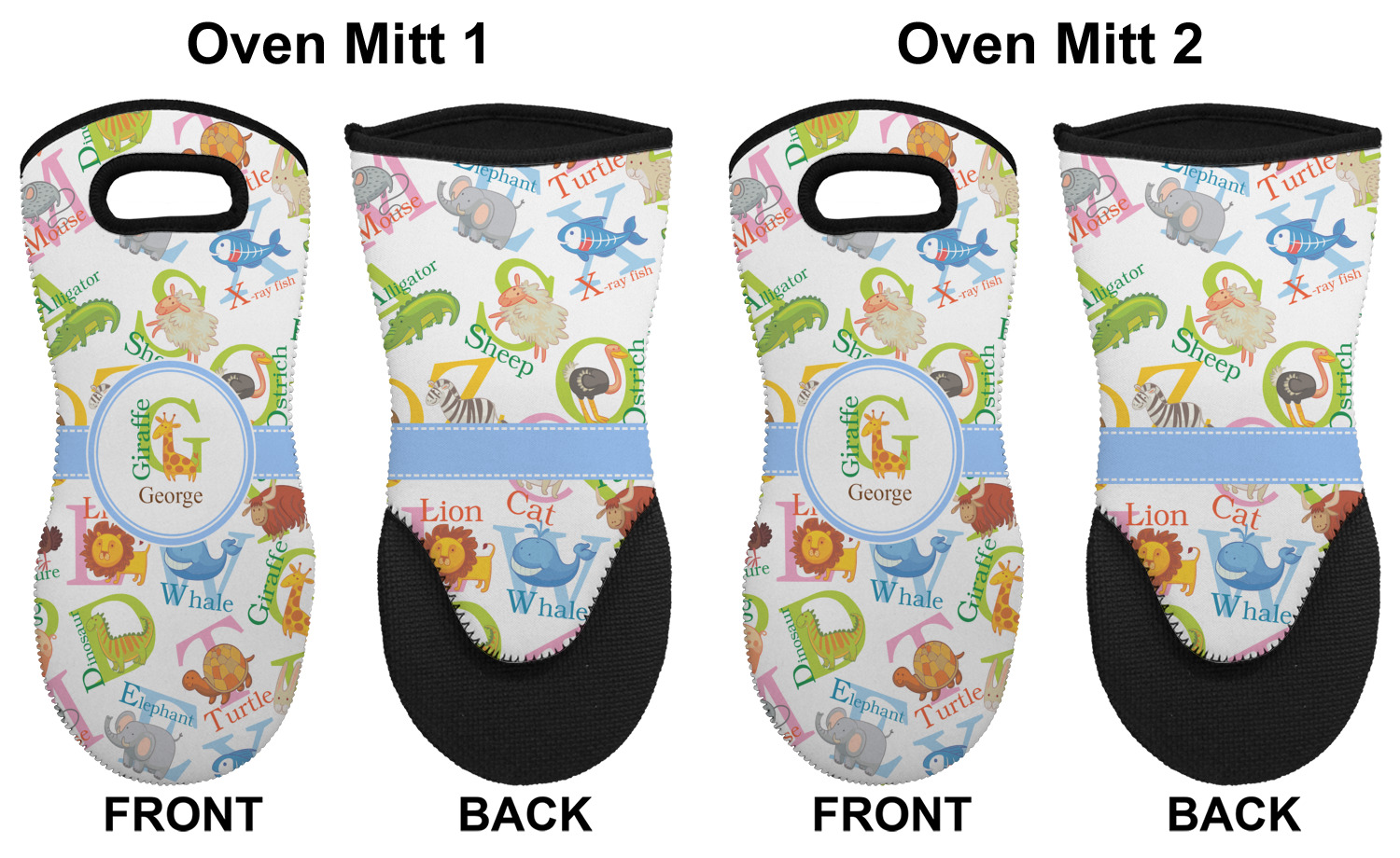 These heat resistant gloves are made entirely of a durable neoprene; the front features a softer texture, while the palm's side has a textured surface, meant to handle heat up to 500 degrees Fahrenheit. Thick, heavy duty stitching connects the two sides. A small, oval cutout appears on the front, and can be used to hang and store the mitt. Your personalization appears on the front, and the upper part of the back of the mitt. The style of these oven mitts are suitable for both the right and left hand, depending on your needs. If you need one for each hand, be sure to order two!