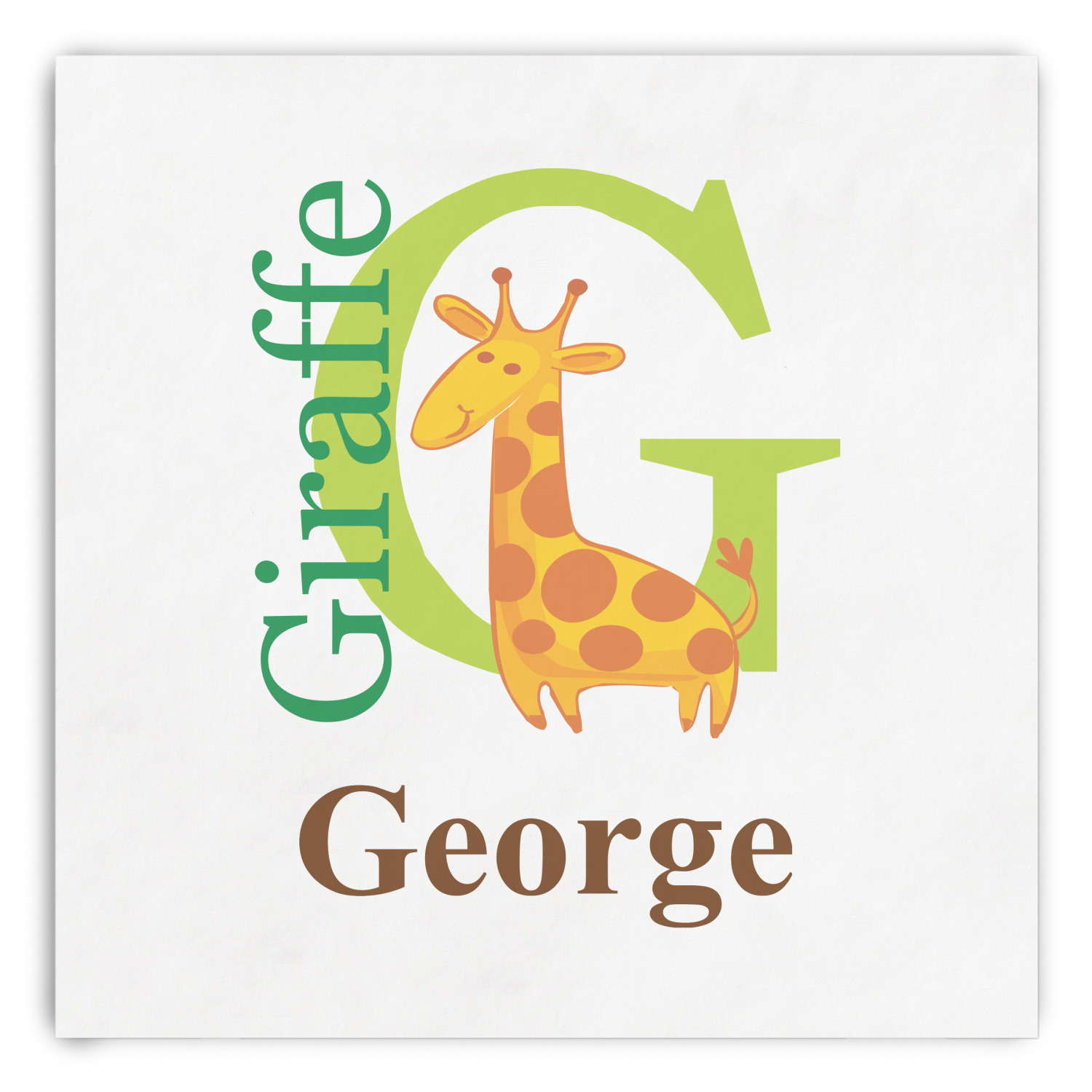 We chose baby blue ribbon with stitching and a round label. For personalization we chose the G for Giraffe and George! With us, you always have a choice of many different colors, label and ribbon styles. For personalization, you can chose the animal alphabet associated with the initial (see image) or you can just choose the animal or you can select a completely different style such as a monogram or a name & initial. You can try our the various combinations in our customization system to see which combination you like the best!
