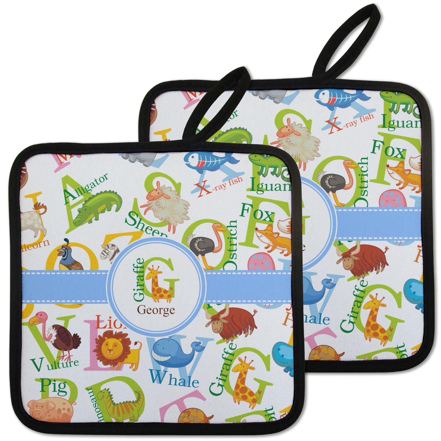 Our personalized pot holders feature a neoprene front that displays your personalization in vibrant colors. The backing of the hot pot holder is rubberized; the textured backing allows you to have a great grip when using this custom pot holder. The two materials are joined with a sleek, black trim, and the holder also includes an attached loop for hanging and storage. The pot holder is approximately 8.75 inches by 8.75 inches and 0.25 inches tall, while the fabric loop is 2.5 inches long. You can purchase a kitchen pot holder by itself or as a set of 2. We also offer a set including one pot holder and one oven mitt.