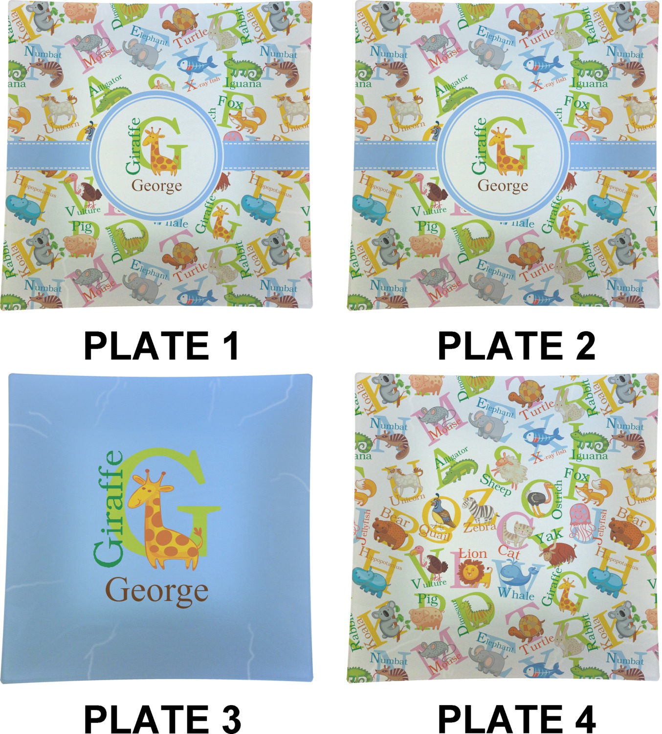 We chose baby blue ribbon with stitching and a round label. For personalization we chose the G for Giraffe and George! With us, you always have a choice of many different colors, label and ribbon styles. For personalization, you can chose the animal alphabet associated with the initial (see image) or you can just choose the animal or you can select a completely different style such as a monogram or a name & initial. You can try our the various combinations in our customization system to see which combination you like the best!