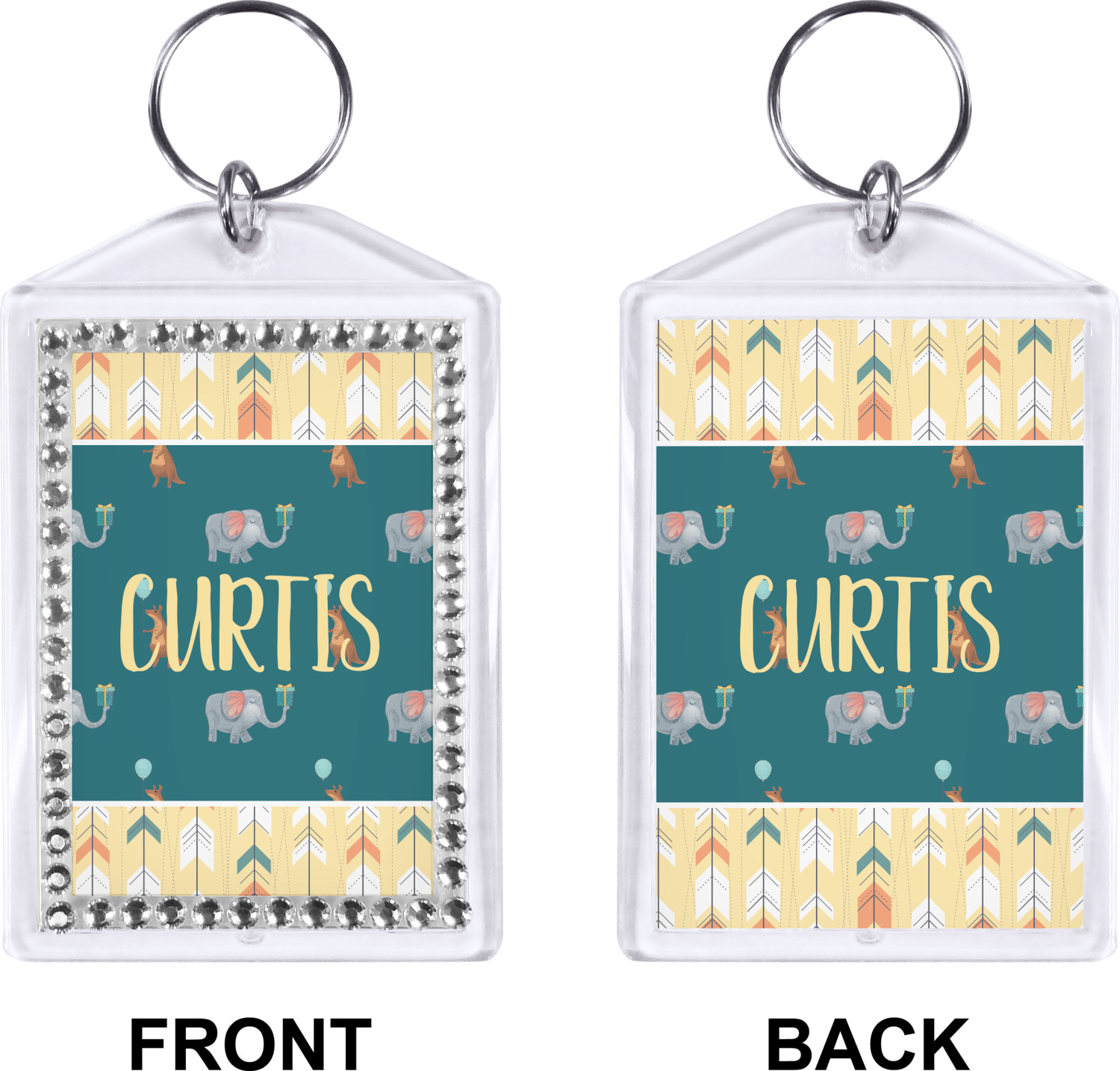 Our personalized keychains have a bold, rectangular shape, outlined by a series of shimmering rhinestones. A metal, split keyring is included with your purchase, and an additional metal hoop allows for attachment of the keychain to the split ring. This unique keychain measures at about 3.75 by 2.5 inches. We print your customized design(s) across both the back and front of this keychain.