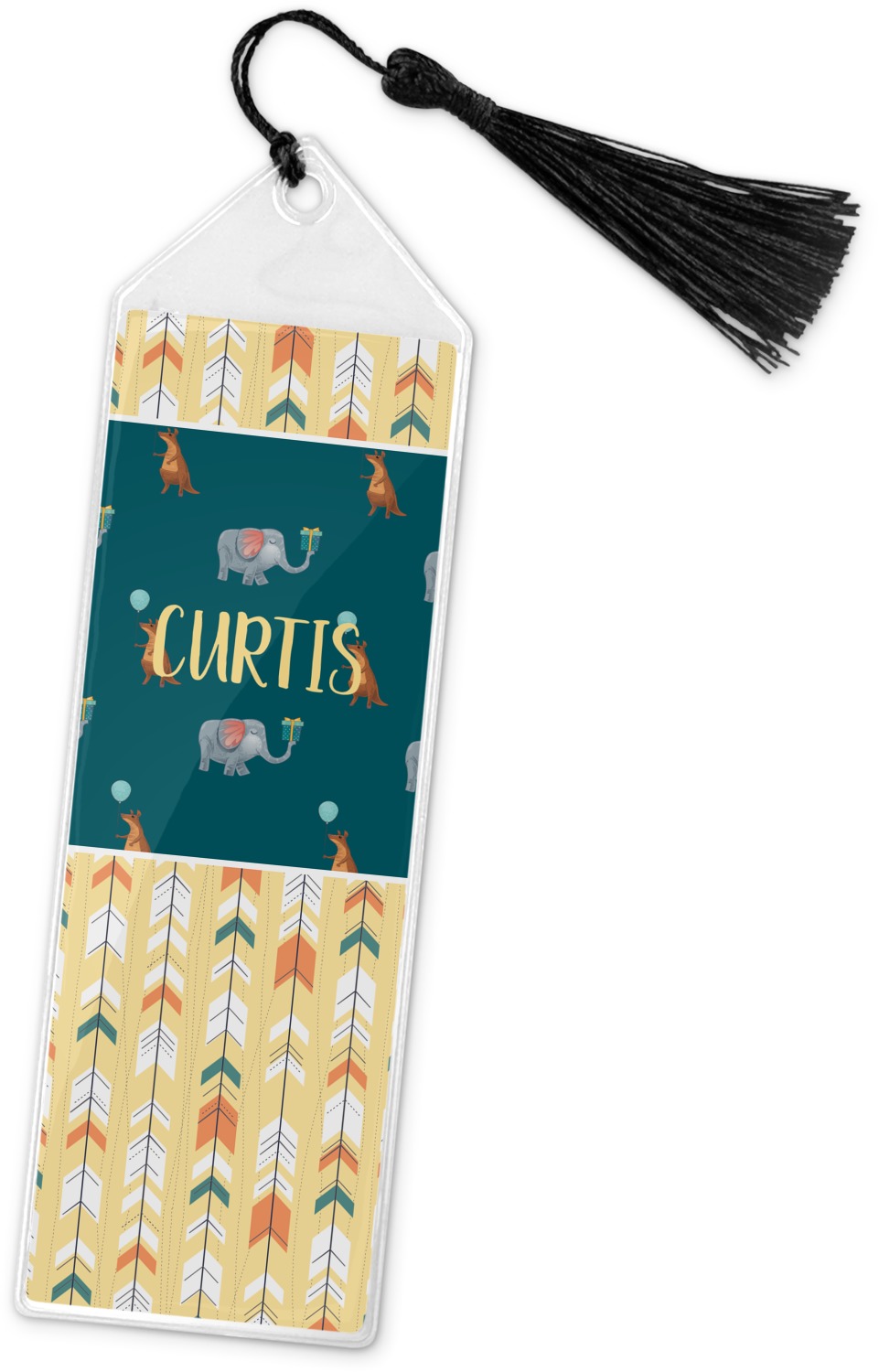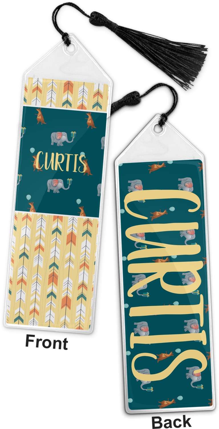 Your personalized bookmark is made of a sturdy, clear vinyl, and is approximately 7.5" x 2.25". We display your personalization on vinyl inserts that are placed on both sides. Accompanying each book marker is a black, fringe tassel that attaches to the reinforced, triangular header.