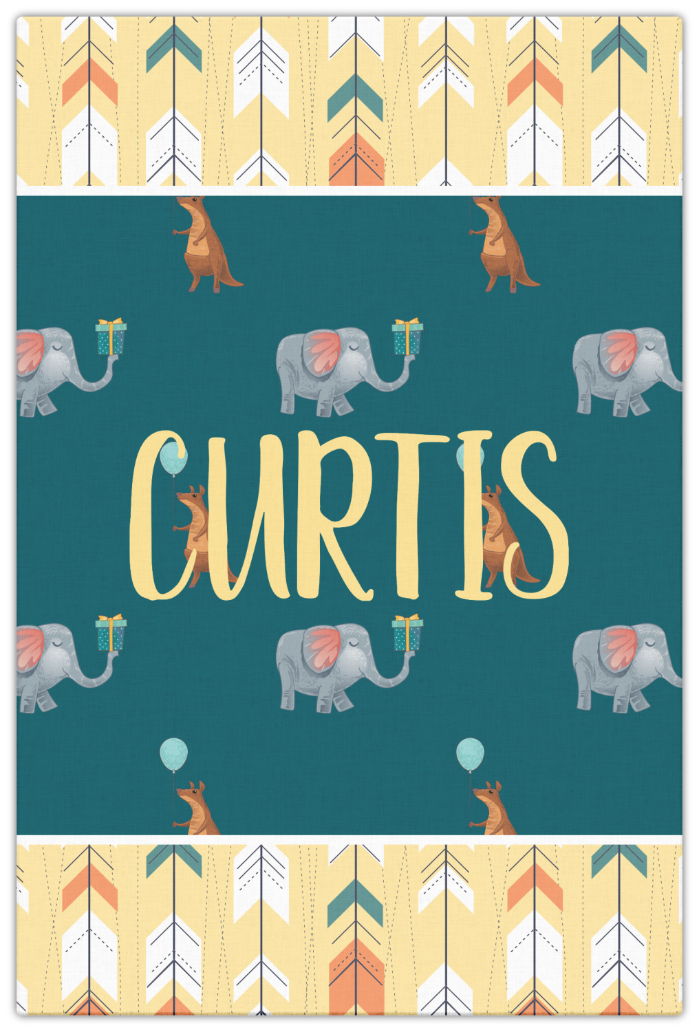 This design has an adorable pattern with a kangaroo and elephant on a dark teal background. The best part of this design is that you can easily swap out the kangaroo or elephant for your the birthday boy / girl's favorite animal! Each animal is holding some sort of party item like presents and balloons.