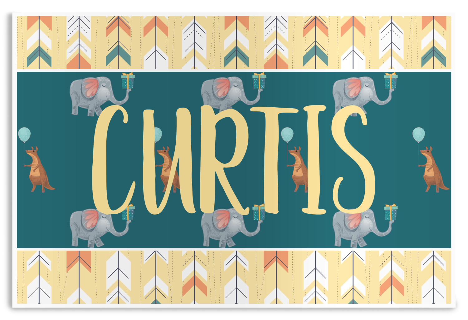 This design has an adorable pattern with a kangaroo and elephant on a dark teal background. The best part of this design is that you can easily swap out the kangaroo or elephant for your the birthday boy / girl's favorite animal! Each animal is holding some sort of party item like presents and balloons.