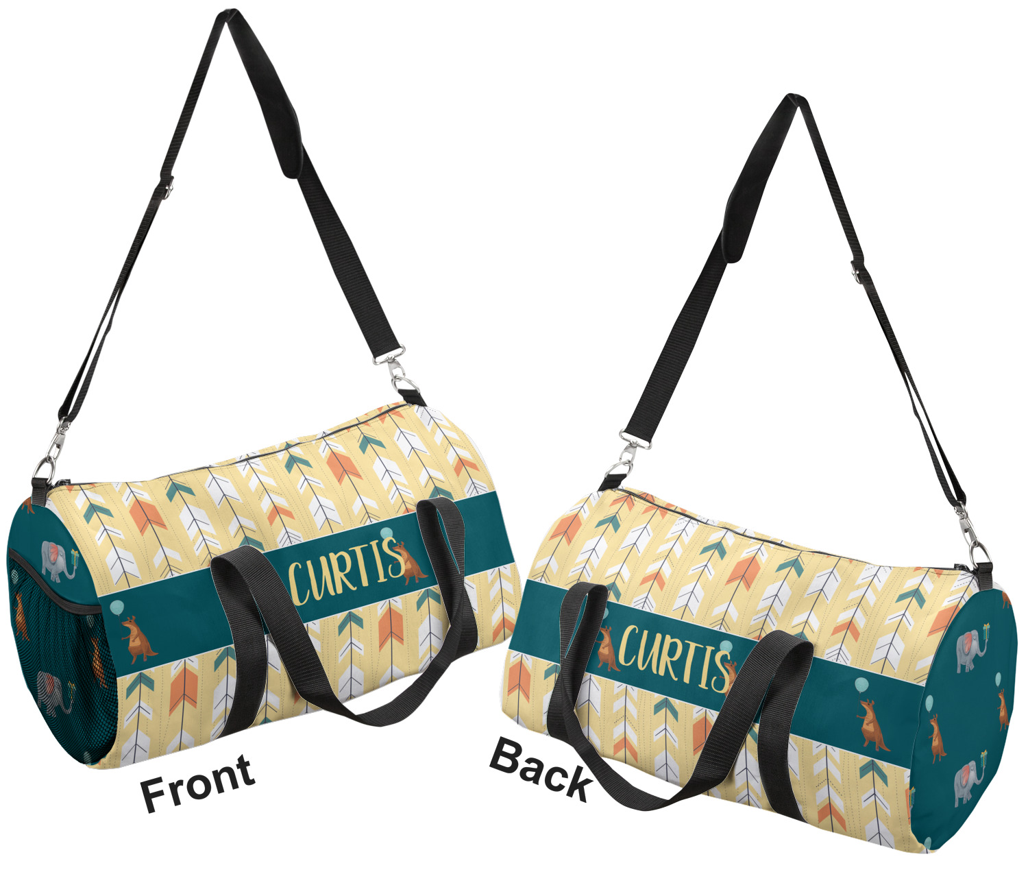 This duffle is a sturdy bag made of a canvas material. It comes in two sizes: Small (19"W x 9.5"H x 9.5"D) and Large (23"W x 12"H x 12"D). The bag is a cylindrical shape with a black adjustable strap and two handles. On one side is an elastic pouch to put a waterbottle or other small item. Your product will be sublimated with your design and is able to be designed on the front, back, and sides. Be sure to remember that the straps may cut into parts of your design if you upload your own artwork.