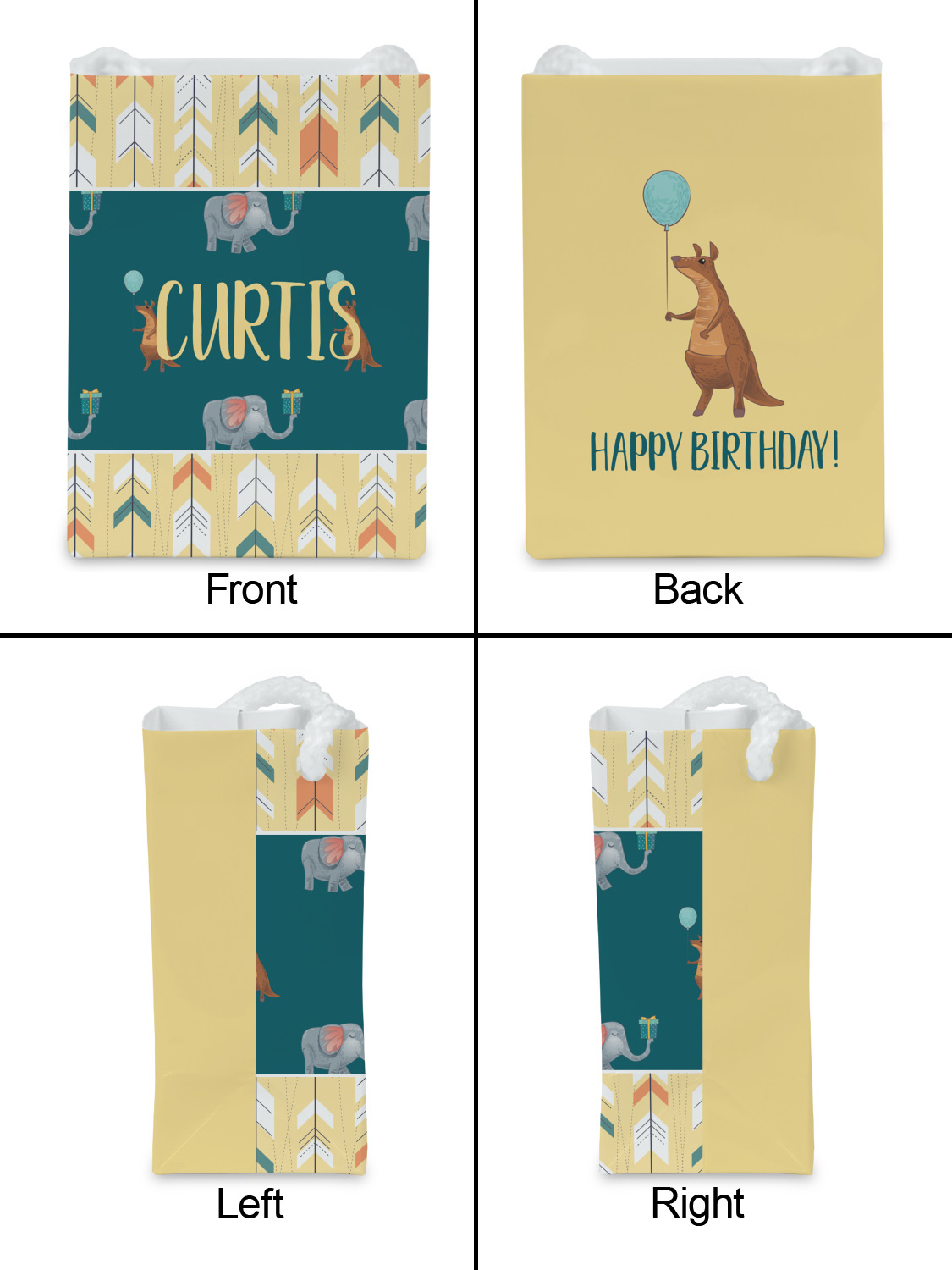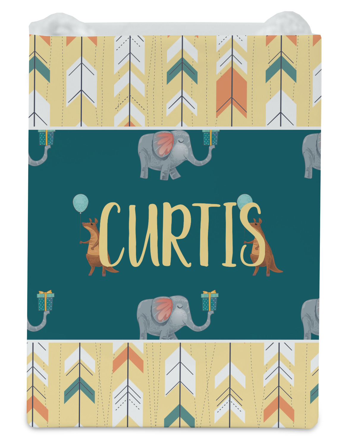 This design has an adorable pattern with a kangaroo and elephant on a dark teal background. The best part of this design is that you can easily swap out the kangaroo or elephant for your the birthday boy / girl's favorite animal! Each animal is holding some sort of party item like presents and balloons.