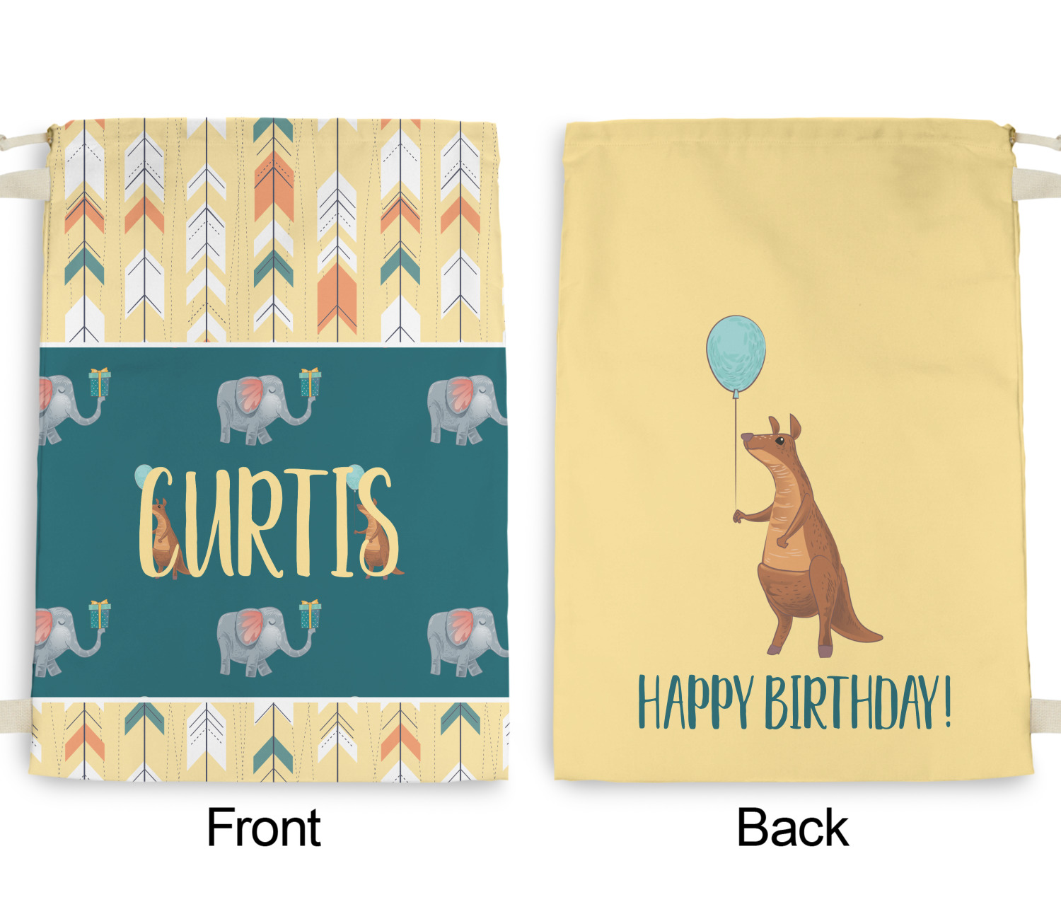 This design has an adorable pattern with a kangaroo and elephant on a dark teal background. The best part of this design is that you can easily swap out the kangaroo or elephant for your the birthday boy / girl's favorite animal! Each animal is holding some sort of party item like presents and balloons.