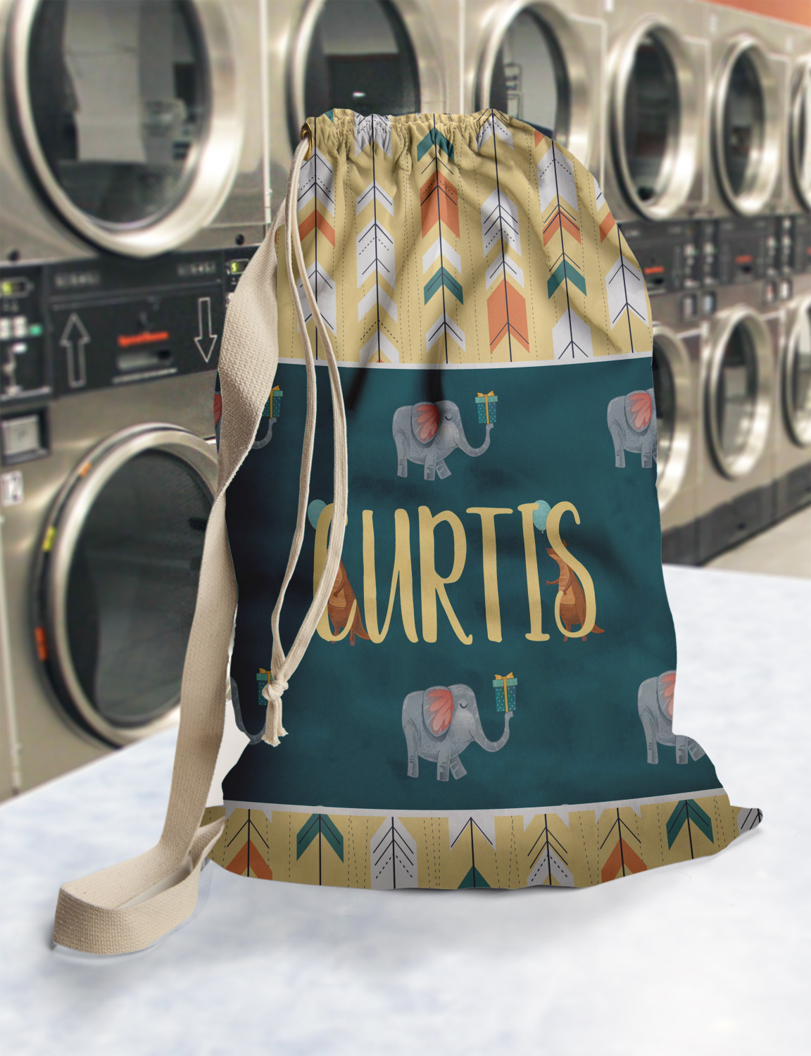 Carry your laundry in style with these customized laundry bags. Available in two sizes, featuring a natural colored woven strap and a cinch cord, these bags hold a lot of clothes or anything else you want to fit in them.