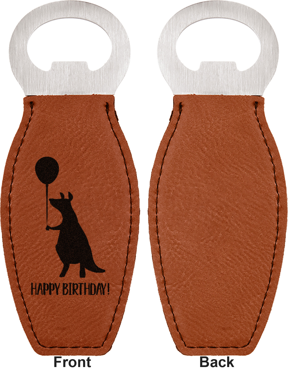 Built from stainless steel, these custom bottle openers are wrapped in a cognac-colored leatherette. Sharp, black stitching lines the edges for extra durability and a finished touch. Your personalization is laser-engraved onto the surface of this leatherette, leaving behind a crisp, black coloration. At 4.6 by 1.8 inches, this beer bottle opener gives you much of leverage when trying to open a stubborn bottle. On the opposite end of the opener, you'll find a magnet that you can use to display your new, unique bottle opener!