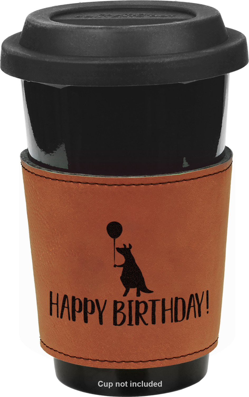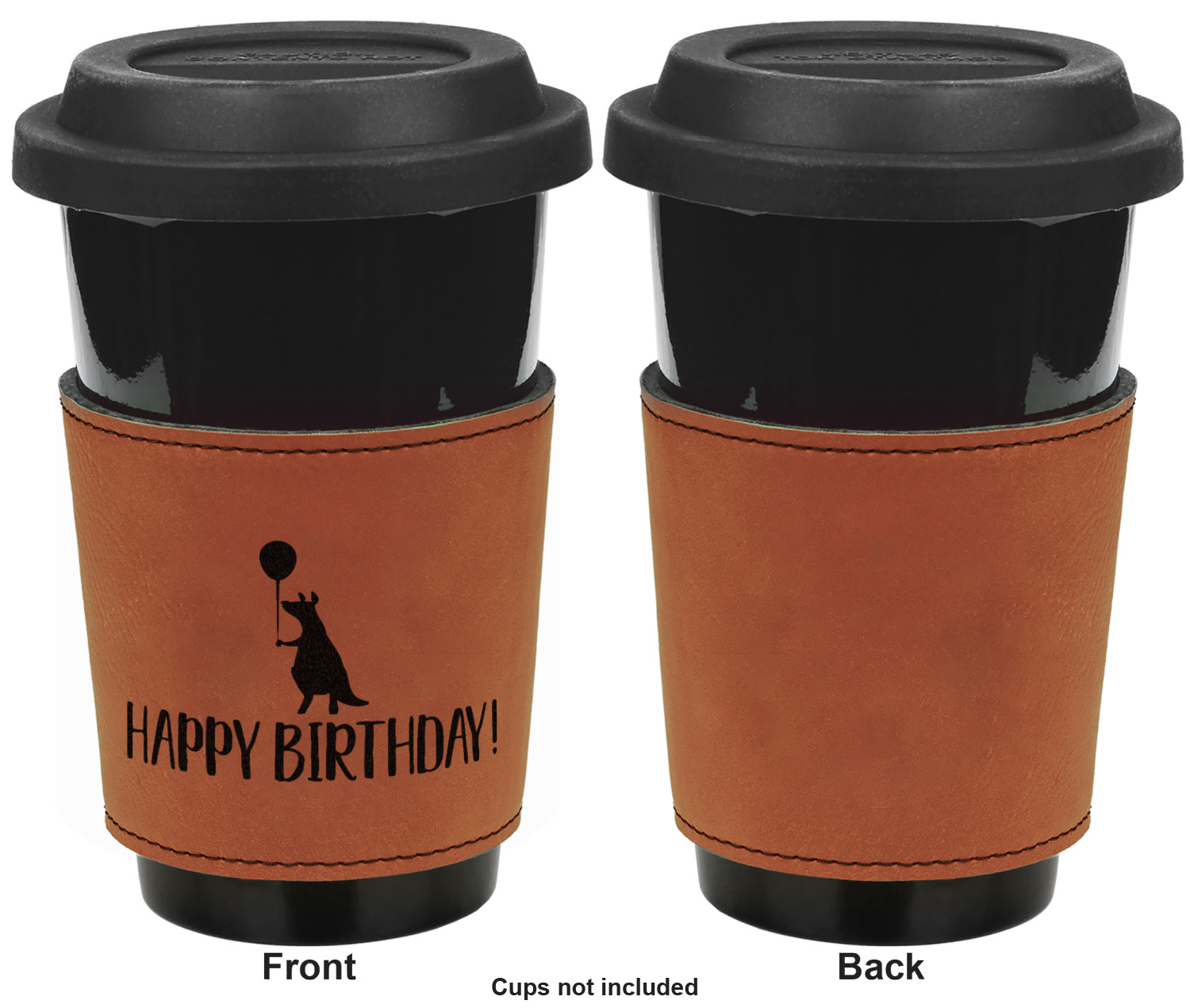 This cup sleeve is made from a suave, cognac-brown leatherette and finished with an intricate, black stitch. The interior of this can sleeve is fabricated from a thin foam material to help insulate your mug's contents. The sleeve is specifically made to suit tapered glasses or mugs, so the top's diameter is 3.5 inches, while the bottom's diameter is 2.75 inches. Your customized design will be laser engraved into the leatherette, leaving behind crisp, black imprint. With these products, we provide you with the option of engraving the front and back, or the front only.
