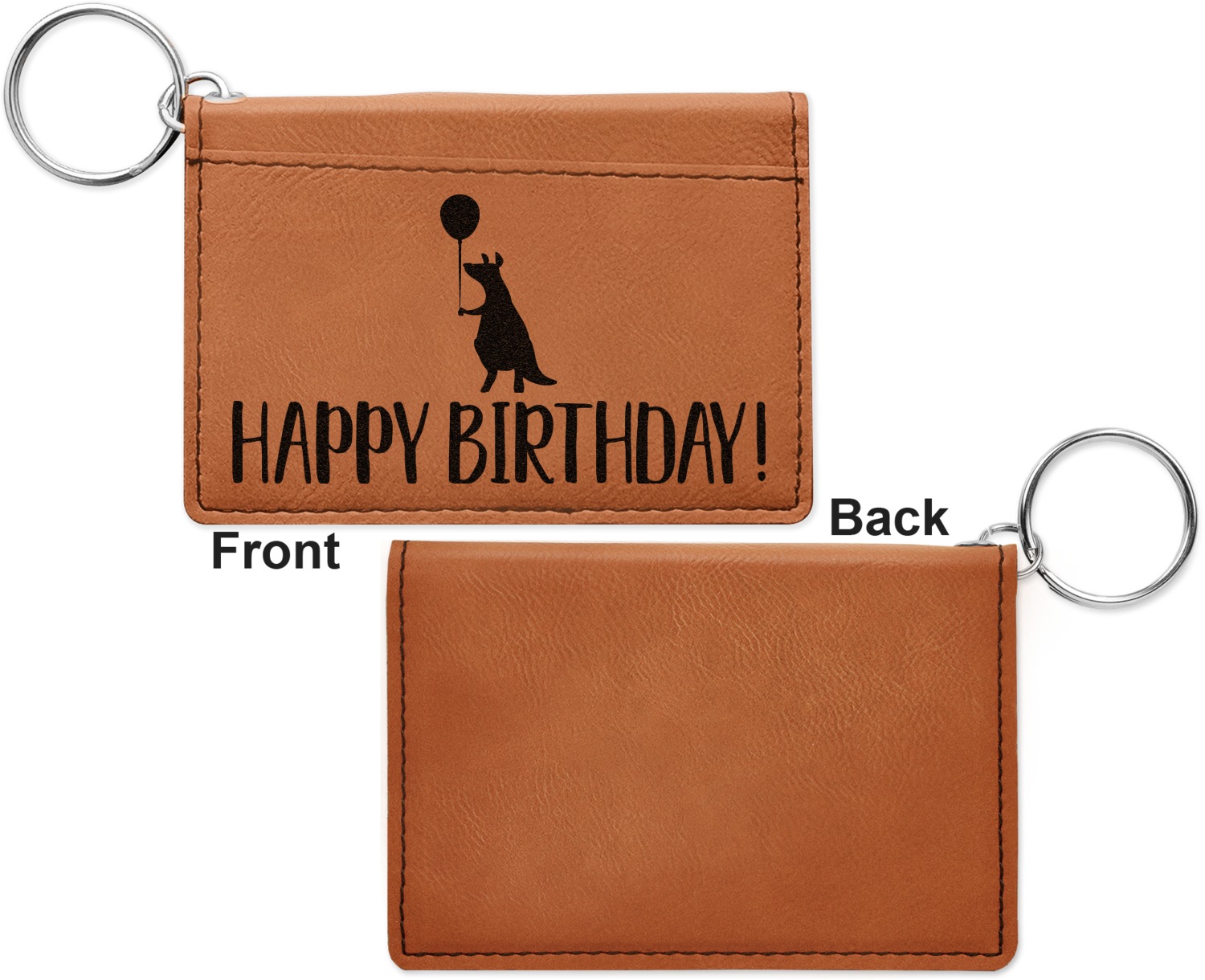 These ID wallet keychains features three pockets on the inside to accommodate your ID and your most frequently used cards. Another pocket occupies the front of the wallet's exterior, and can hold some cash or another card. The wallet is accompanied by a thick metal ring for easy attachment to a belt clip or purse. Each card holder keychain measures at 4.25 by 3 inches and is a beautiful, cognac, medium-brown shade. The personalized monogram, font, or graphic of your choosing is laser engraved into the surface of the wallet, creating a black imprint. We sell these ID wallets in two models: single sided and double sided engraving.