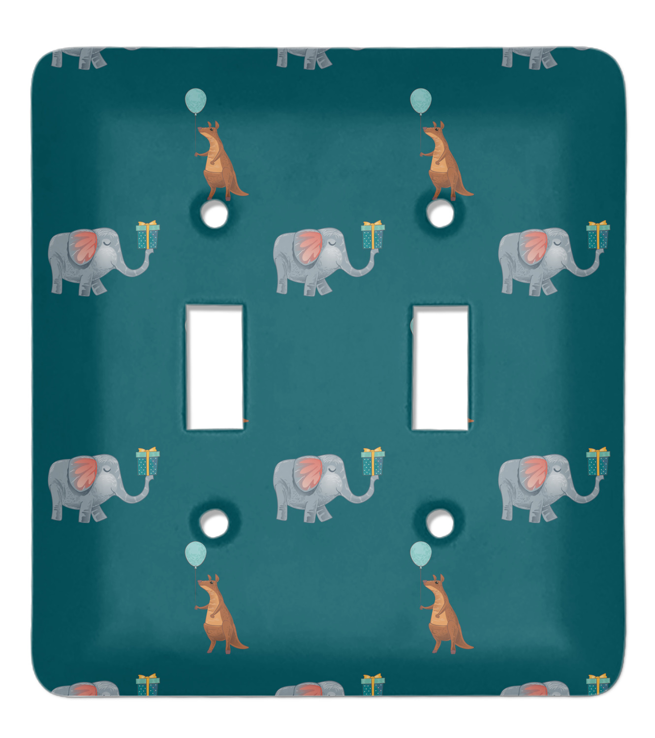 This design has an adorable pattern with a kangaroo and elephant on a dark teal background. The best part of this design is that you can easily swap out the kangaroo or elephant for your the birthday boy / girl's favorite animal! Each animal is holding some sort of party item like presents and balloons.