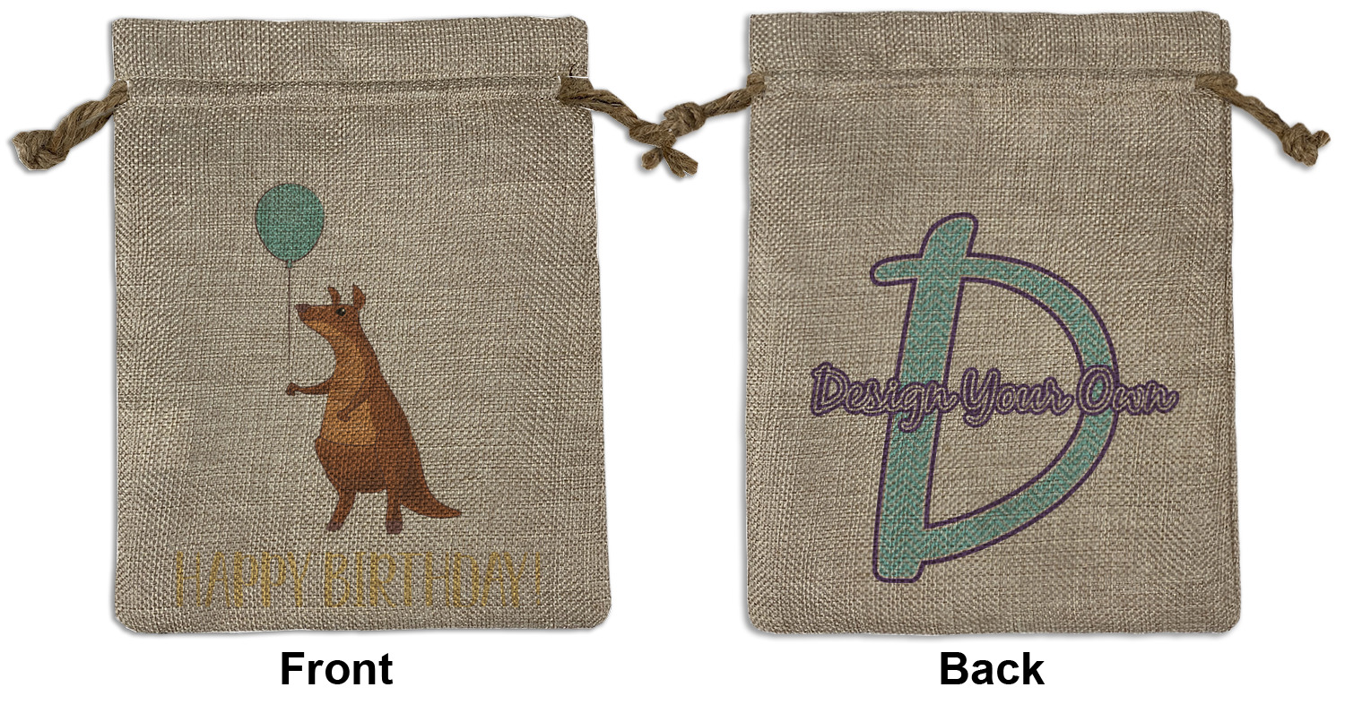 We sell our Burlap Gift Bags in 3 variant sized bags. Made with burlap polyester, each personalized bag can be secured with a twine drawstring pull. Your custom design is available to print on one side or both sides - completely up to you! The sizes of the bags measure approximately 4.5" x 6.5" for the smallest size, 6.5" x 8.0" for the medium size, and 6.5" x 13.5" for the large-sized bag.