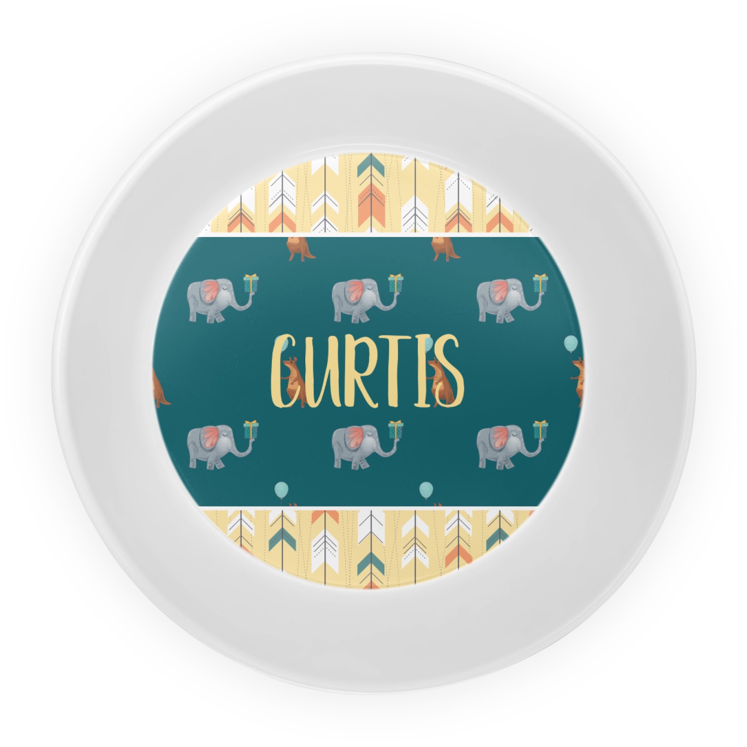 This design has an adorable pattern with a kangaroo and elephant on a dark teal background. The best part of this design is that you can easily swap out the kangaroo or elephant for your the birthday boy / girl's favorite animal! Each animal is holding some sort of party item like presents and balloons.