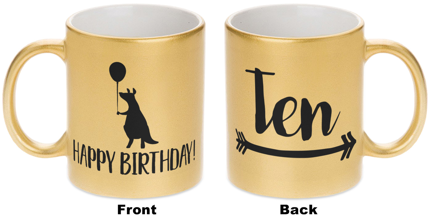 Our custom mugs are ceramic, which is great for keeping your tea or coffee warm! We offer two metallic mugs to personalize - Silver or Gold. Both styles hold around 11oz and have dimensions of approximately 3.75" x 3.5" x 4.75". Both the metallic mugs come in a matte finish and have glitter detailing to add a more pristine feel to the gold and silver base colors.