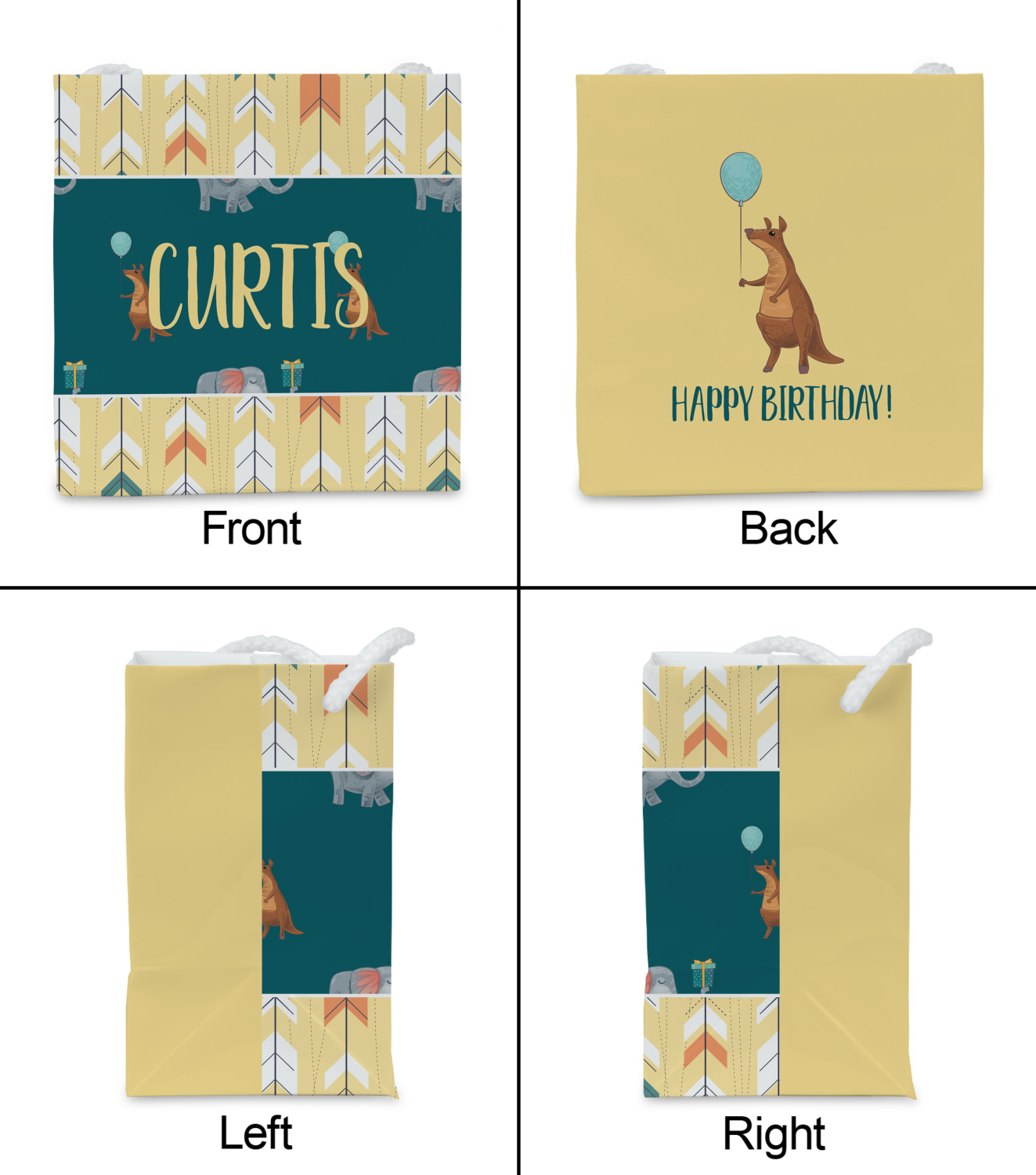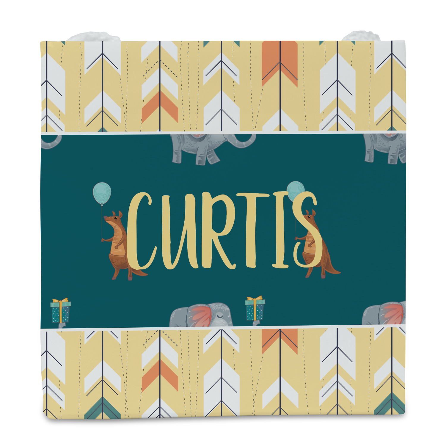 This design has an adorable pattern with a kangaroo and elephant on a dark teal background. The best part of this design is that you can easily swap out the kangaroo or elephant for your the birthday boy / girl's favorite animal! Each animal is holding some sort of party item like presents and balloons.