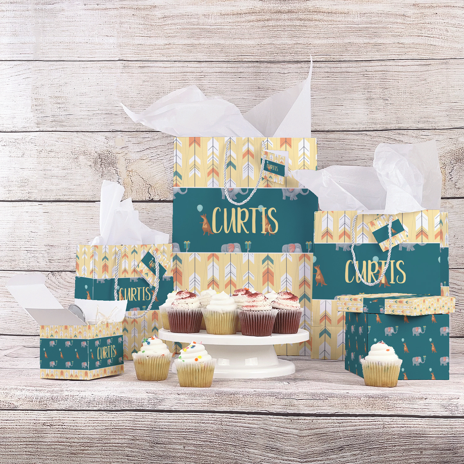 This design has an adorable pattern with a kangaroo and elephant on a dark teal background. The best part of this design is that you can easily swap out the kangaroo or elephant for your the birthday boy / girl's favorite animal! Each animal is holding some sort of party item like presents and balloons.