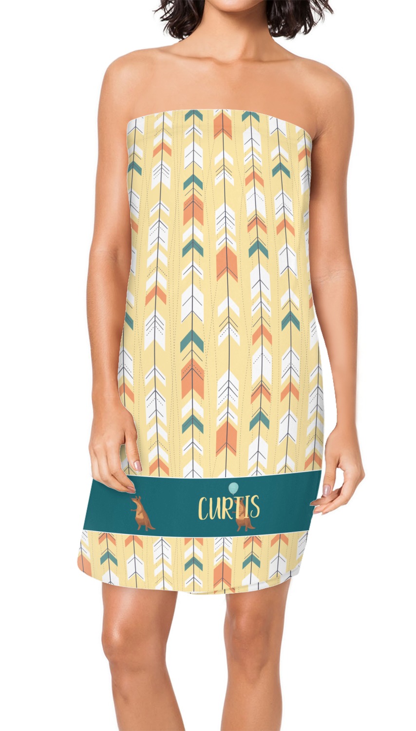 Made from a plush, fleece fabric, these luxurious towel wraps are comfortable and absorbent. They are printed, cut, and sewn for you, right here in the USA, after you place your order. These personalized bath wraps measure at approximately 59 by 32 inches, and display your customization across the outside.