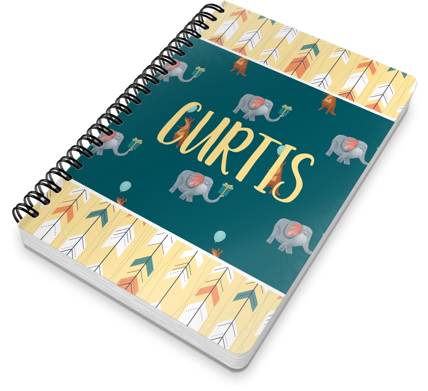 This spiral notebook includes 75 sheets of thick, ruled paper. The front and back of this custom notebook is made of a robust, laminate, plastic covering. We print your personalization on these two panels, underneath a glossy finish, which emphasizes the colors of your design. The two panels and the sheets of paper are held together by a sturdy, black coil. The paper within your bound notebook is perforated for easy, clean tearing.