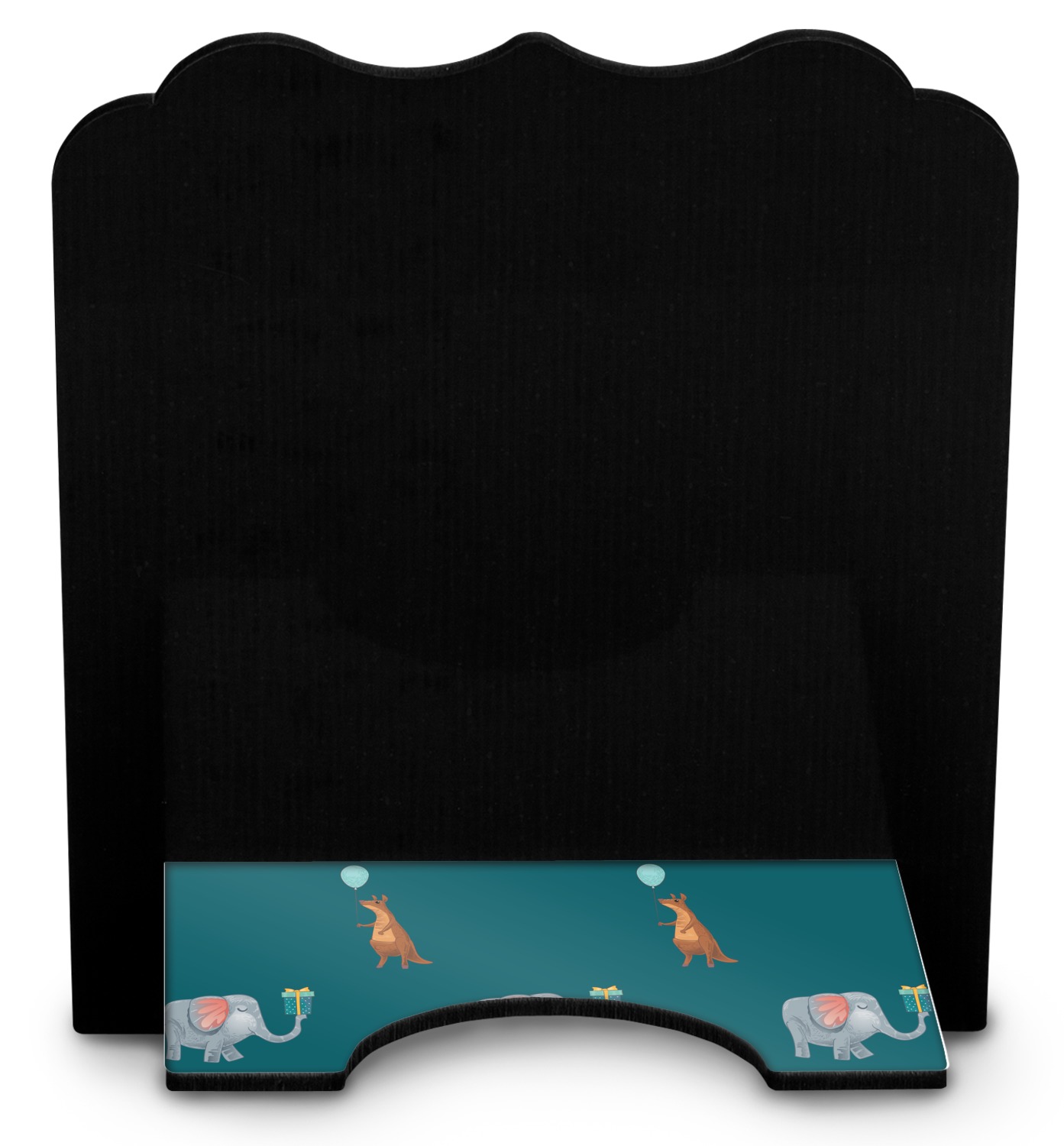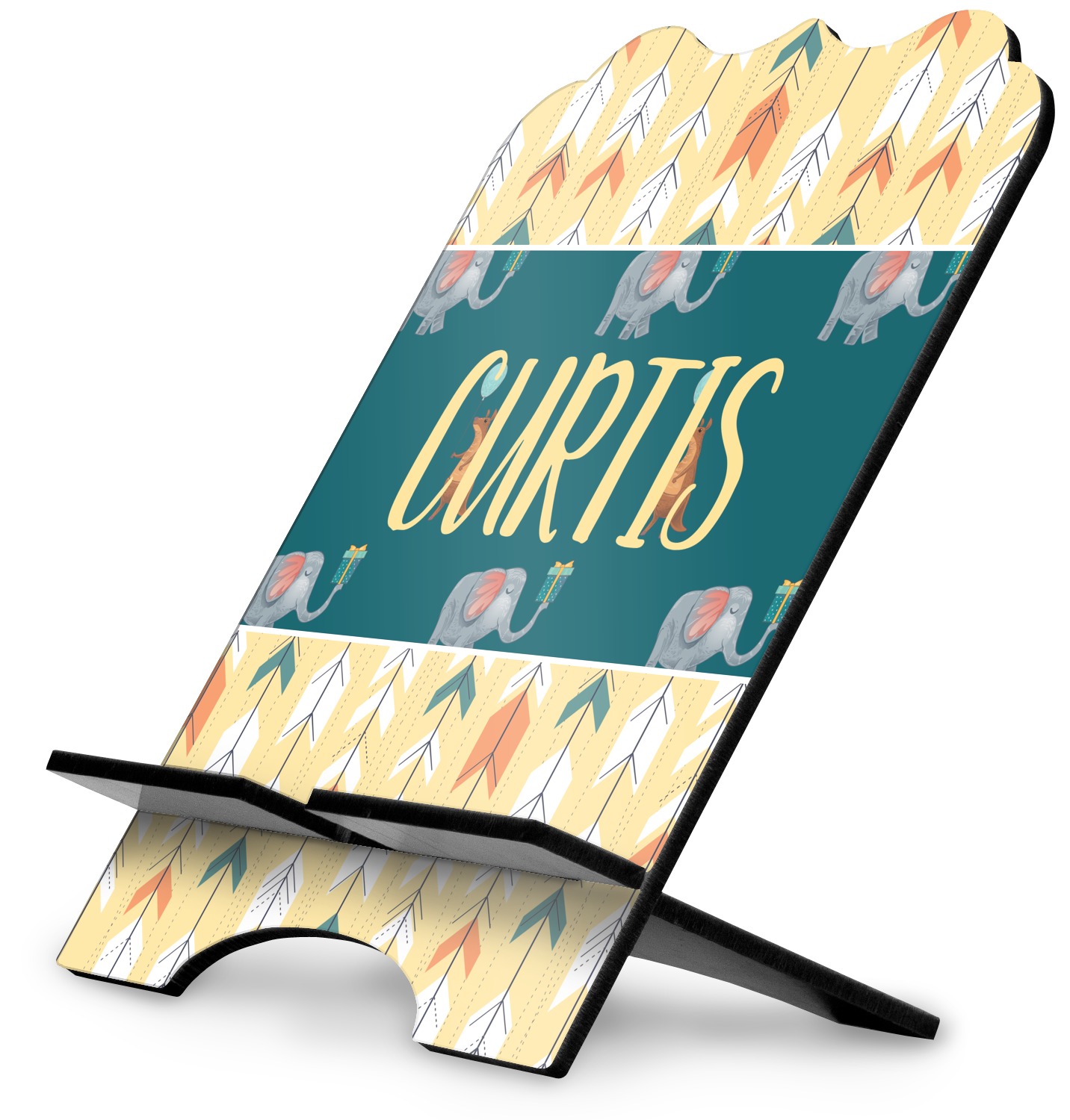 The stand is comprised of two hardboard pieces that fit snugly together and stabilize one another. The bottom part of the iPad stand supports your tablet, and has space for your tablets charger while in use. At 9.25" x 11.5", this tablet mount can support a device between the sizes of the iPad Pro and the iPad Mini 2. The uppermost part of the stand features a decorative, curved edge for a classy, suave appearance. We print your customization atop the face of the stand, in vibrant color. The remaining sides are colored a sleek black.