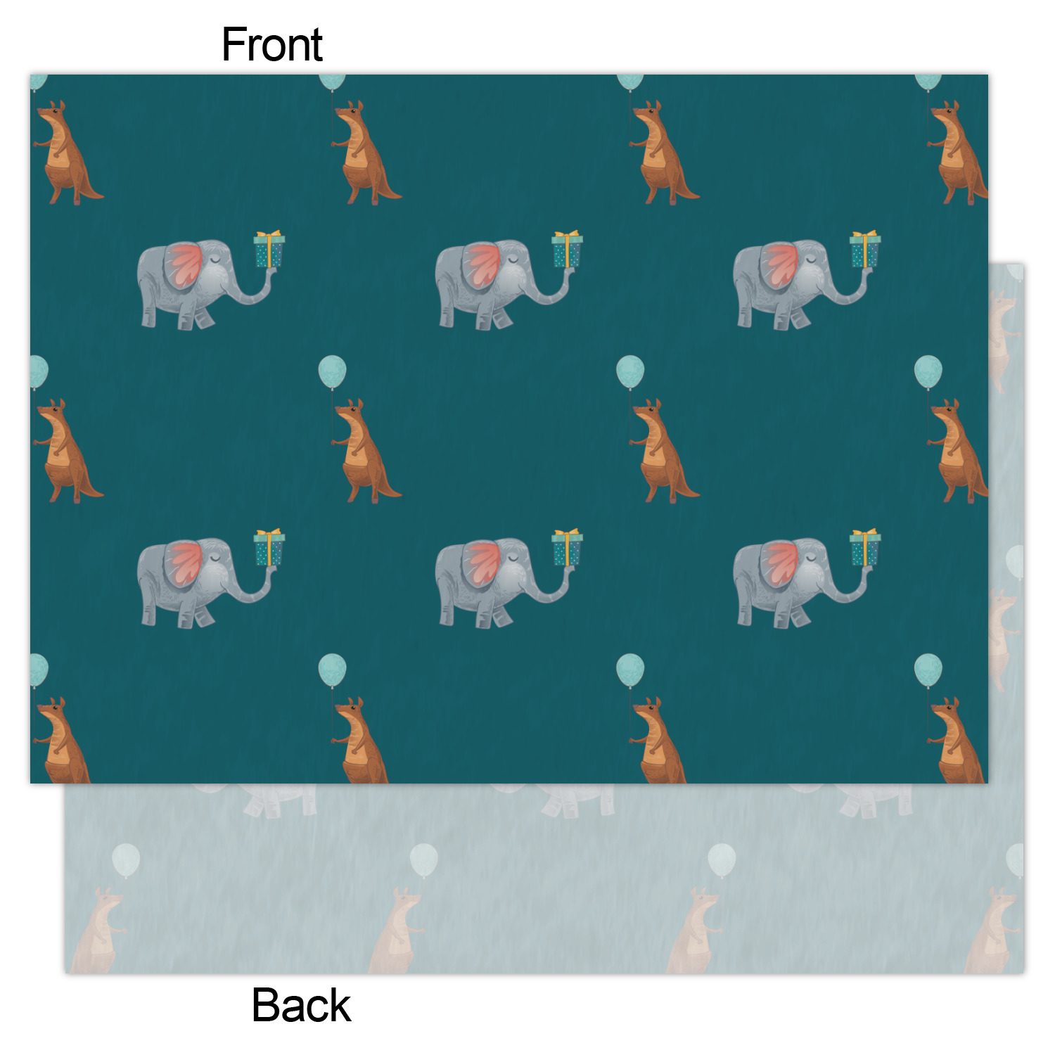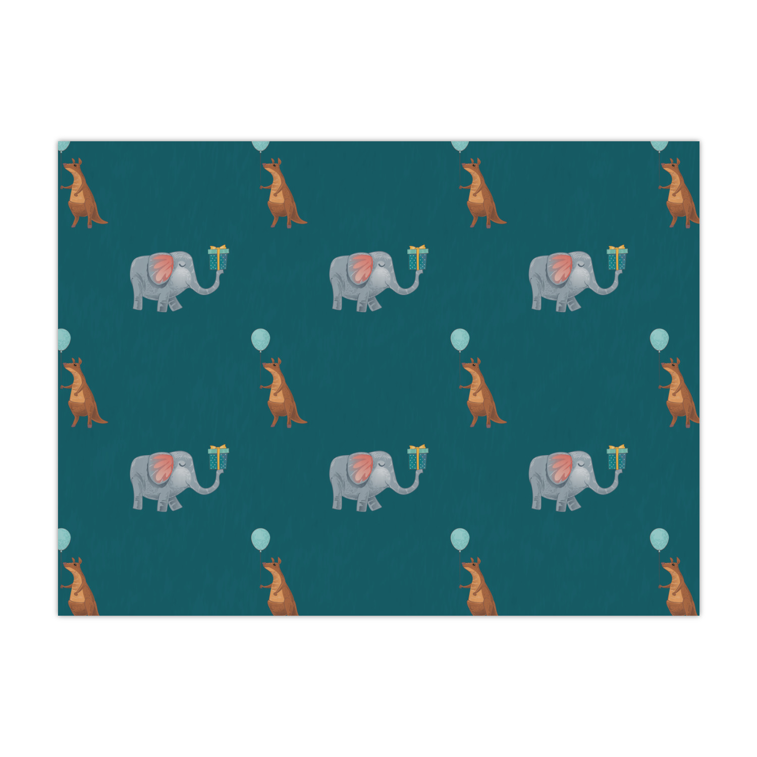 This design has an adorable pattern with a kangaroo and elephant on a dark teal background. The best part of this design is that you can easily swap out the kangaroo or elephant for your the birthday boy / girl's favorite animal! Each animal is holding some sort of party item like presents and balloons.