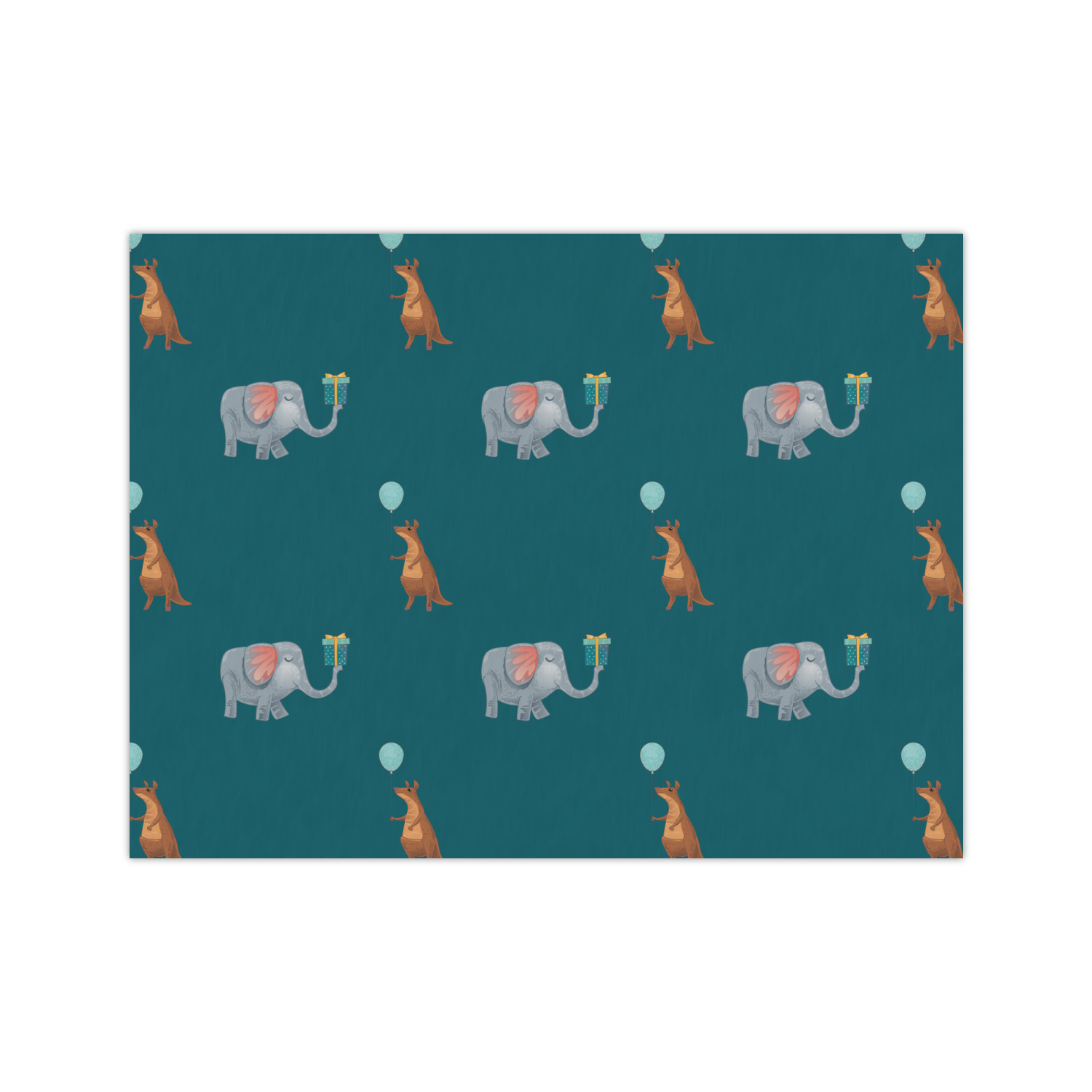 This design has an adorable pattern with a kangaroo and elephant on a dark teal background. The best part of this design is that you can easily swap out the kangaroo or elephant for your the birthday boy / girl's favorite animal! Each animal is holding some sort of party item like presents and balloons.