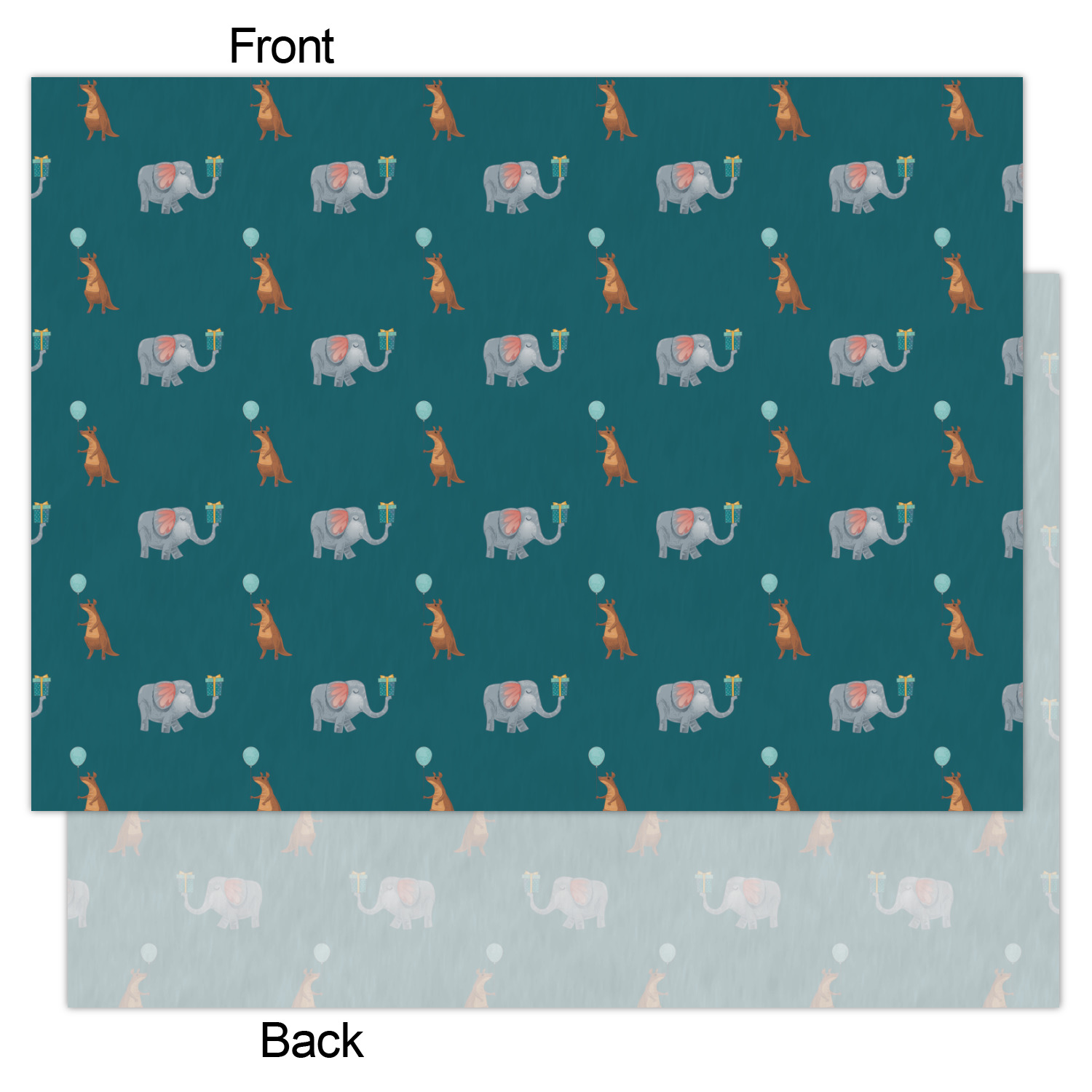 This design has an adorable pattern with a kangaroo and elephant on a dark teal background. The best part of this design is that you can easily swap out the kangaroo or elephant for your the birthday boy / girl's favorite animal! Each animal is holding some sort of party item like presents and balloons.